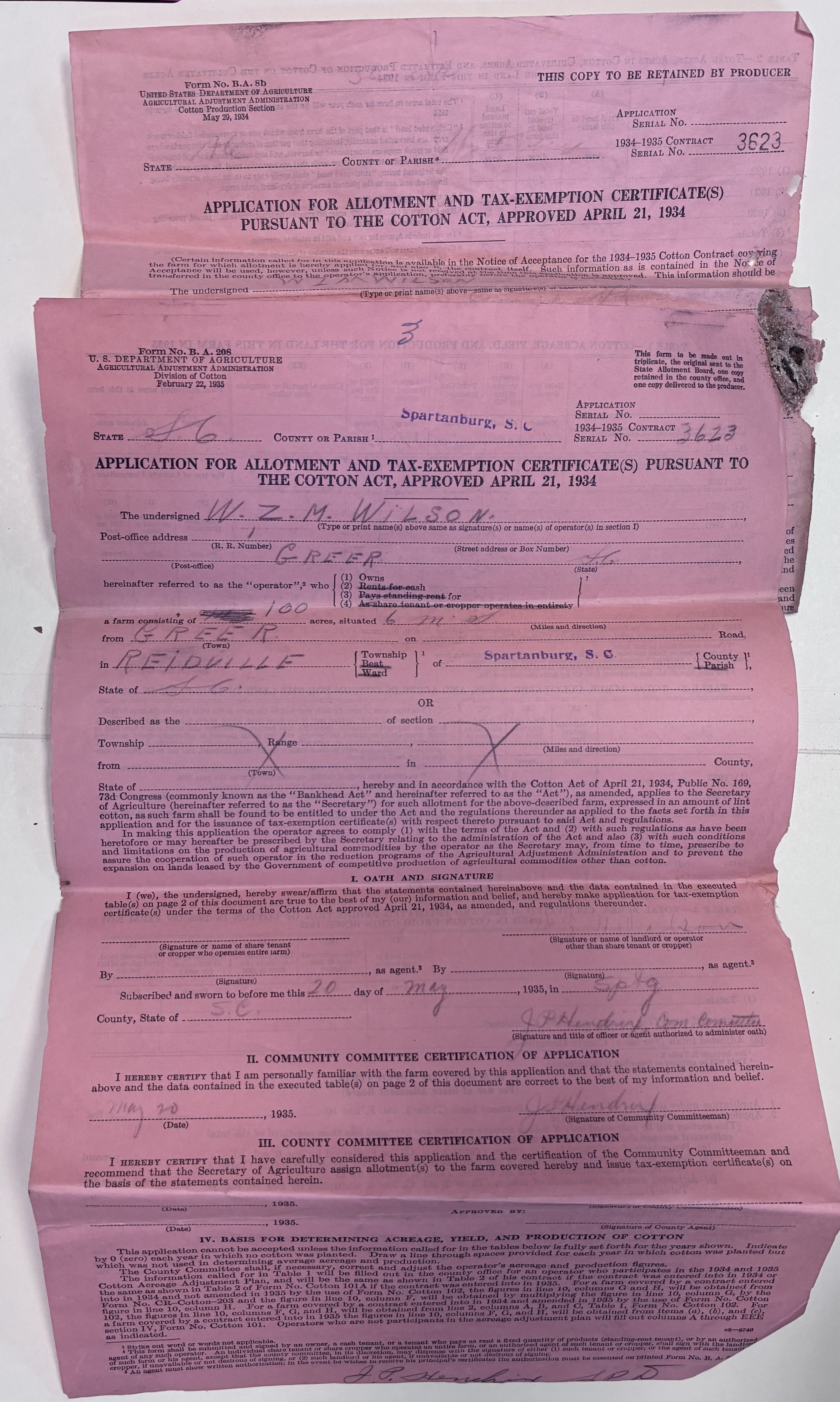 2 Pink applications for allotment and tax-exemption certificate stuck together, for W.Z.M. Wilson