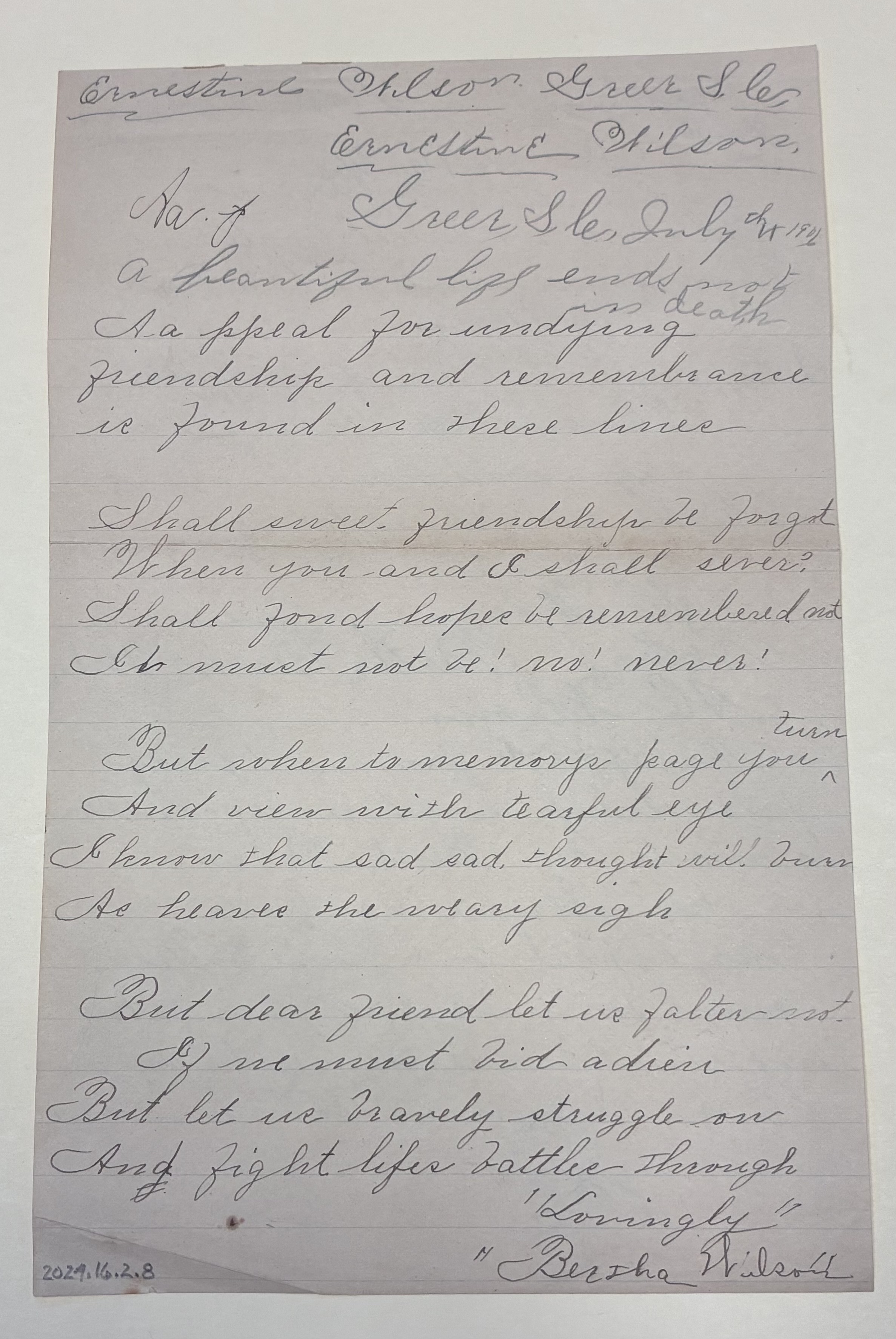 An appeal for undying friendship and rememembrance is made by Bertha Wilsonin the following lines