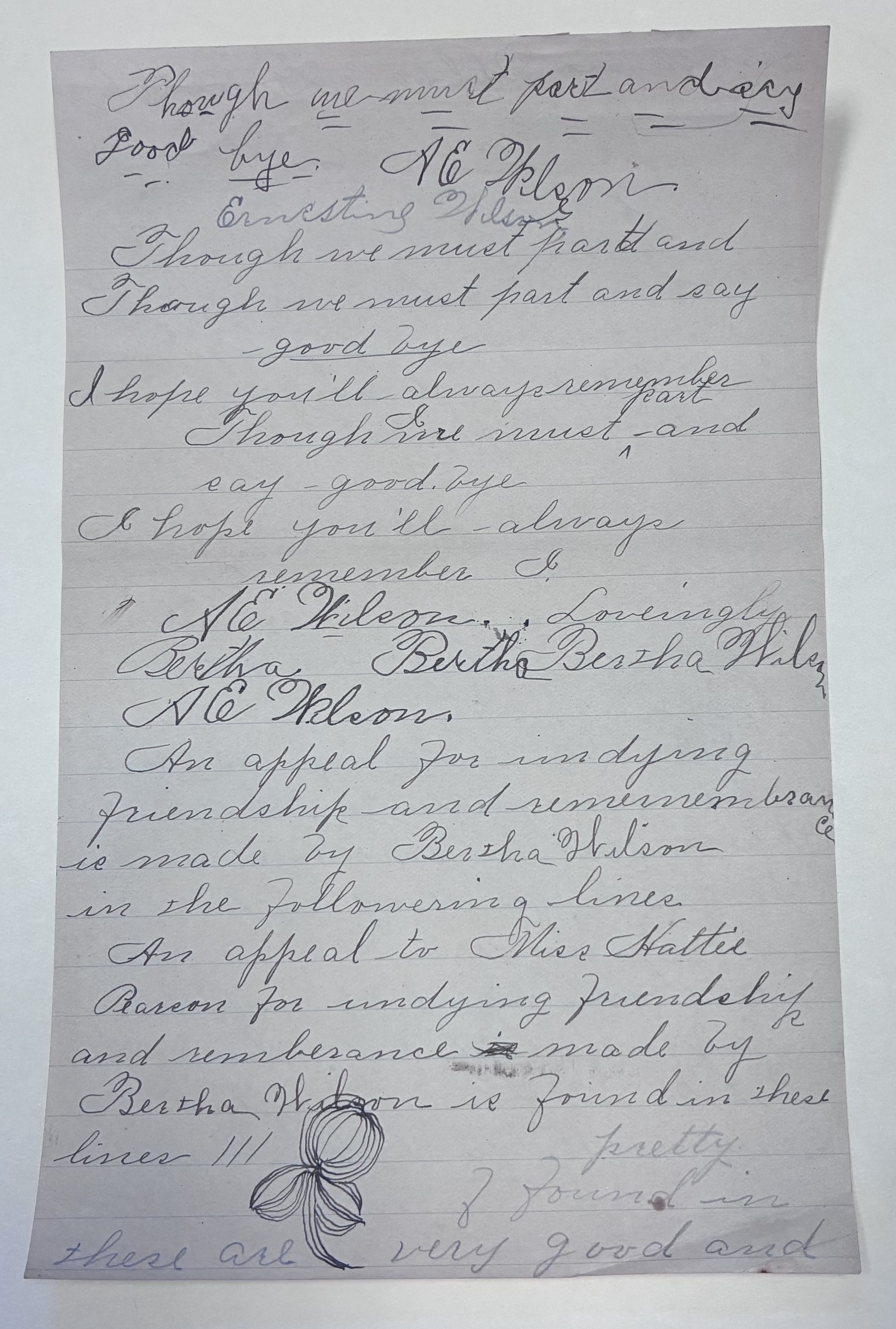 An appeal to Miss Hattie Baseon for undying friendship and remberance is [is struck out] made by Bertha Wilson is friend in these lives III pretty