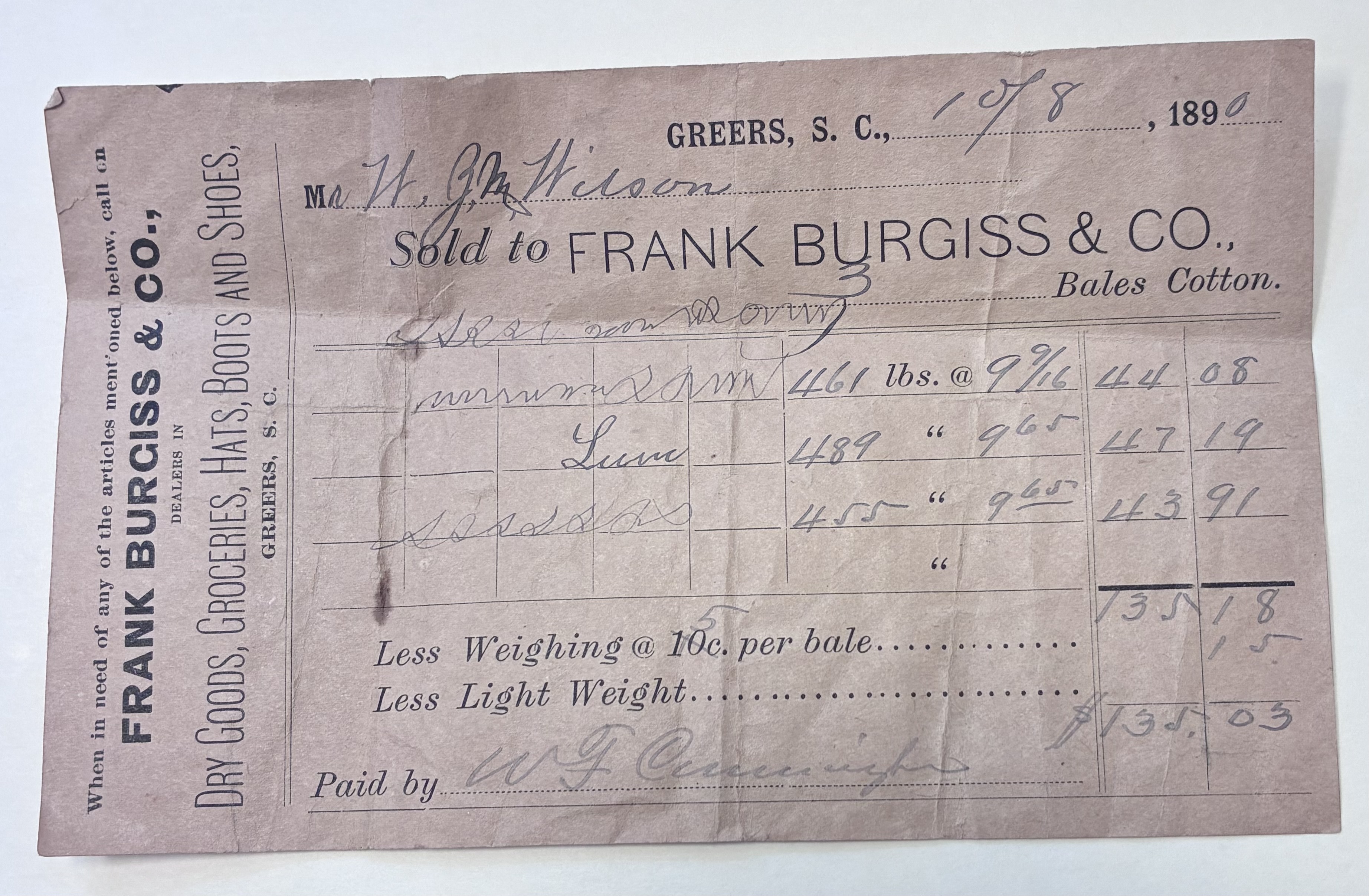 Part of W.Z.M. Wilson to Frank Burgiss & CO. Receipt, Greers, S.C., October 8, 1890