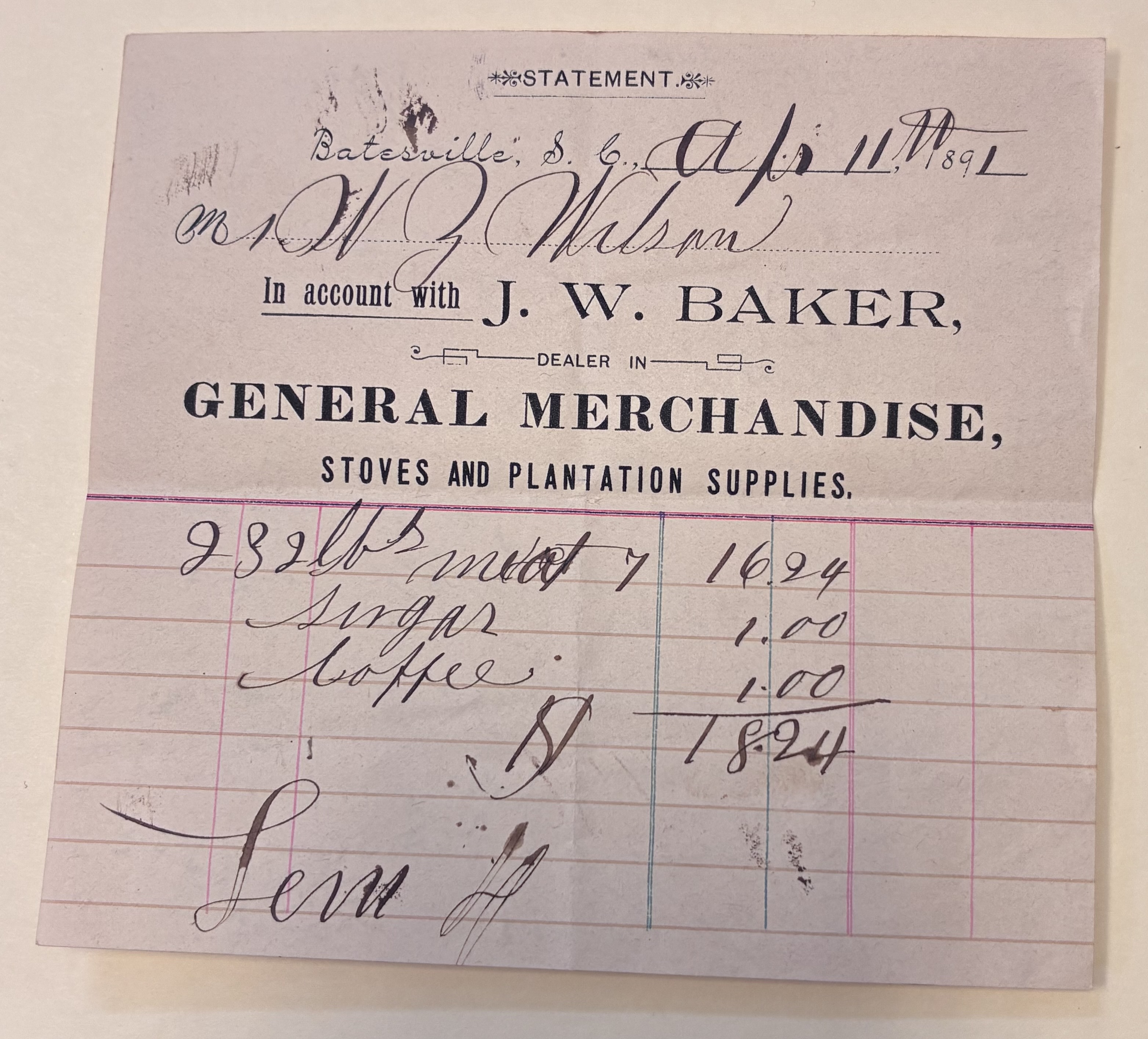 W.Z.M. Wilson bought from J.W. Baker, dealer in General Merchandise, Stoves and Plantation Supplies, Batesville, S.C.