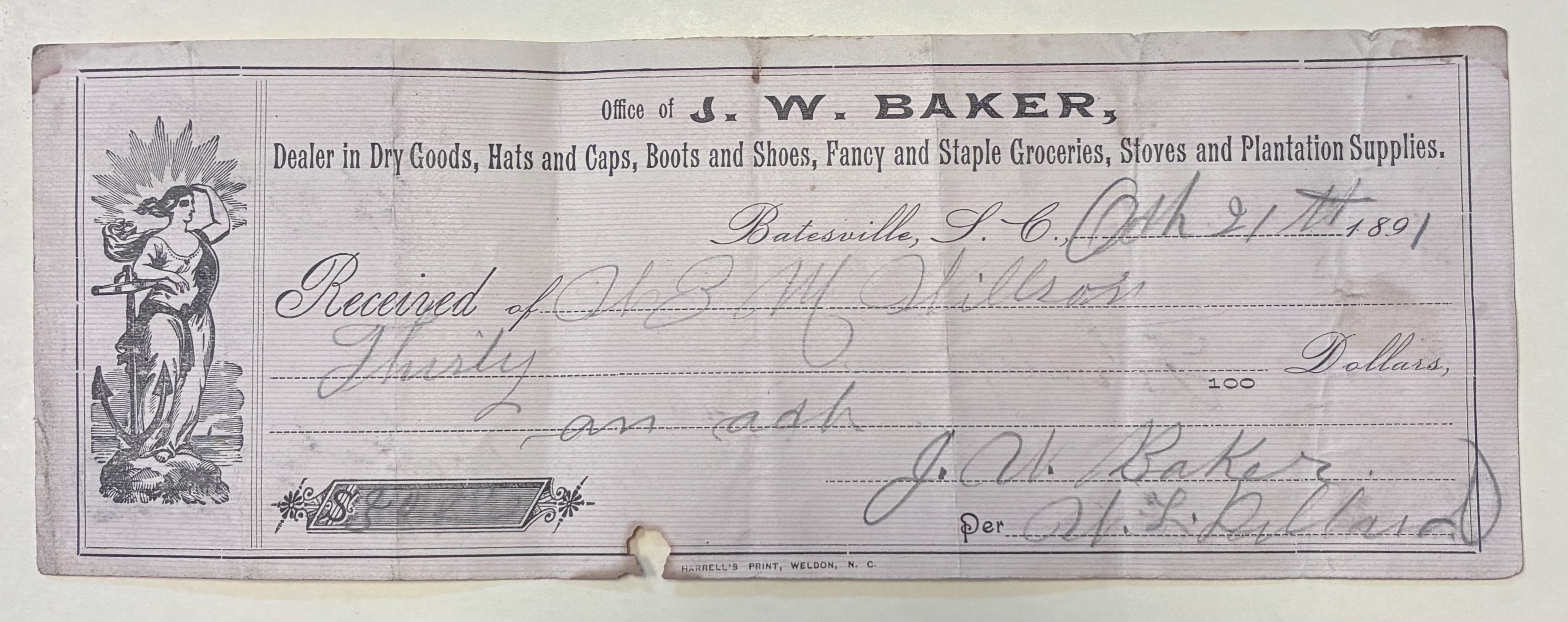 - J.W. Baker received $30 from W.Z.M. Wilson, Batesville, S.C.