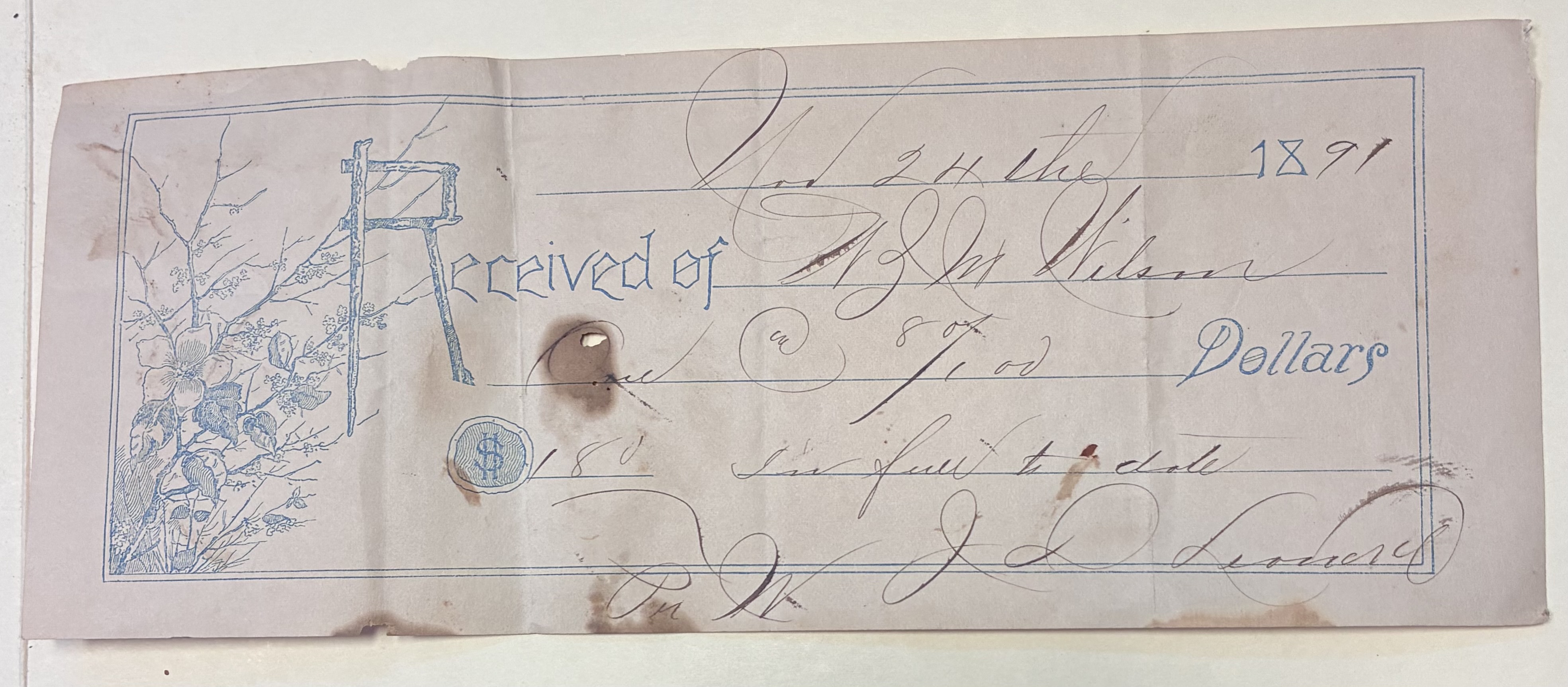 - J.D. Leonard Receipt, November 24, 1891