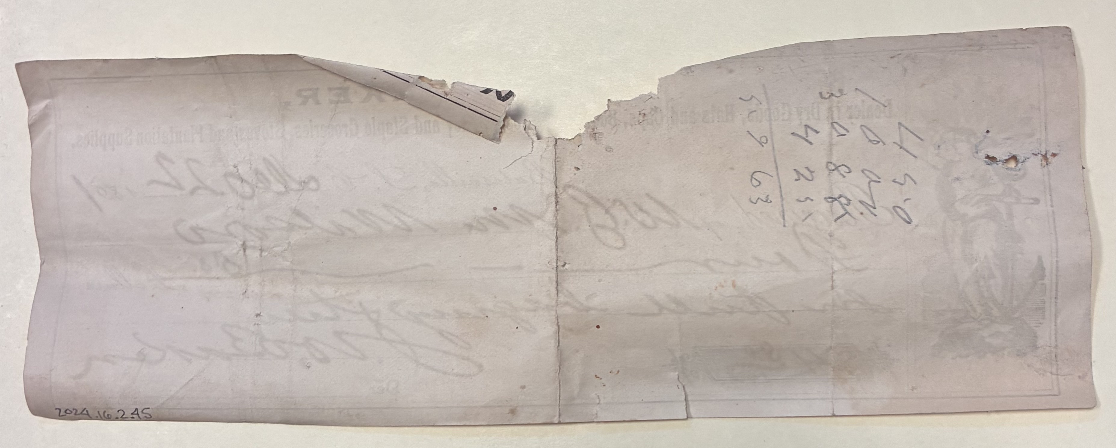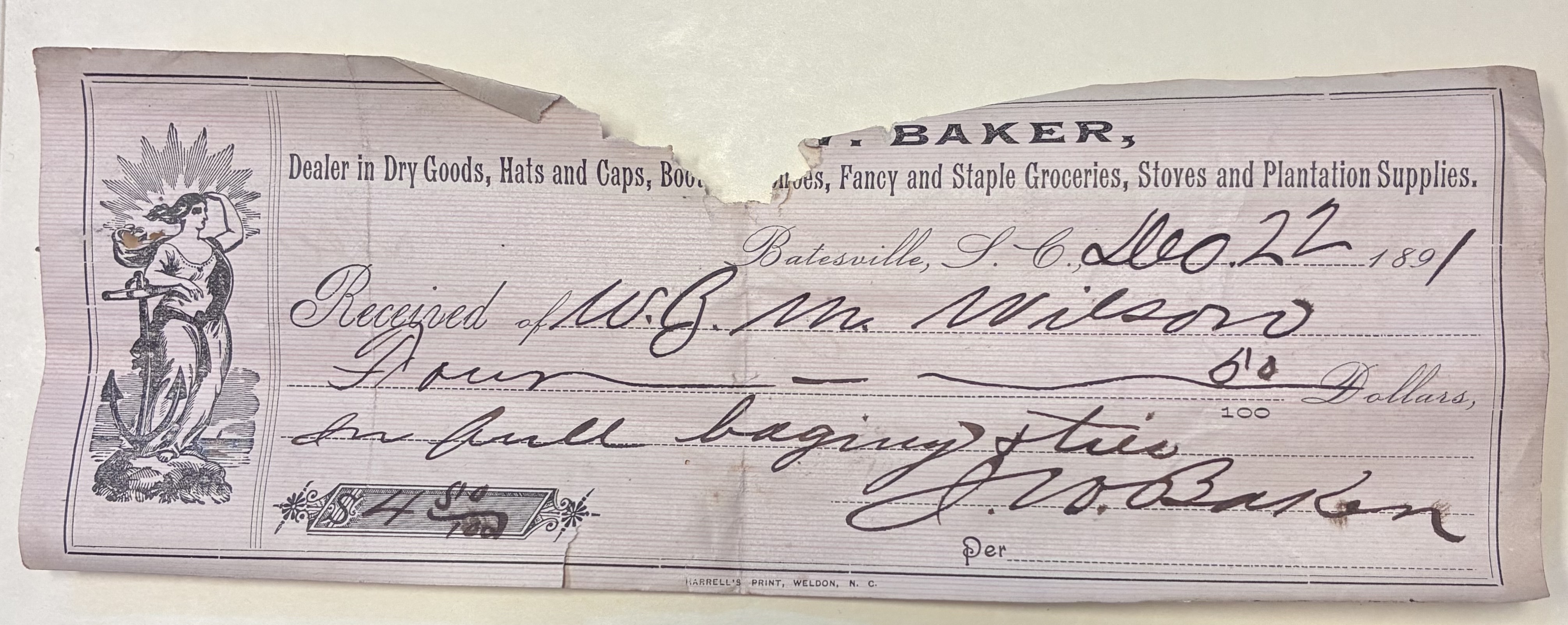 Part of J.W. Baker Receipt, Batesville, S.C., December 22, 1891