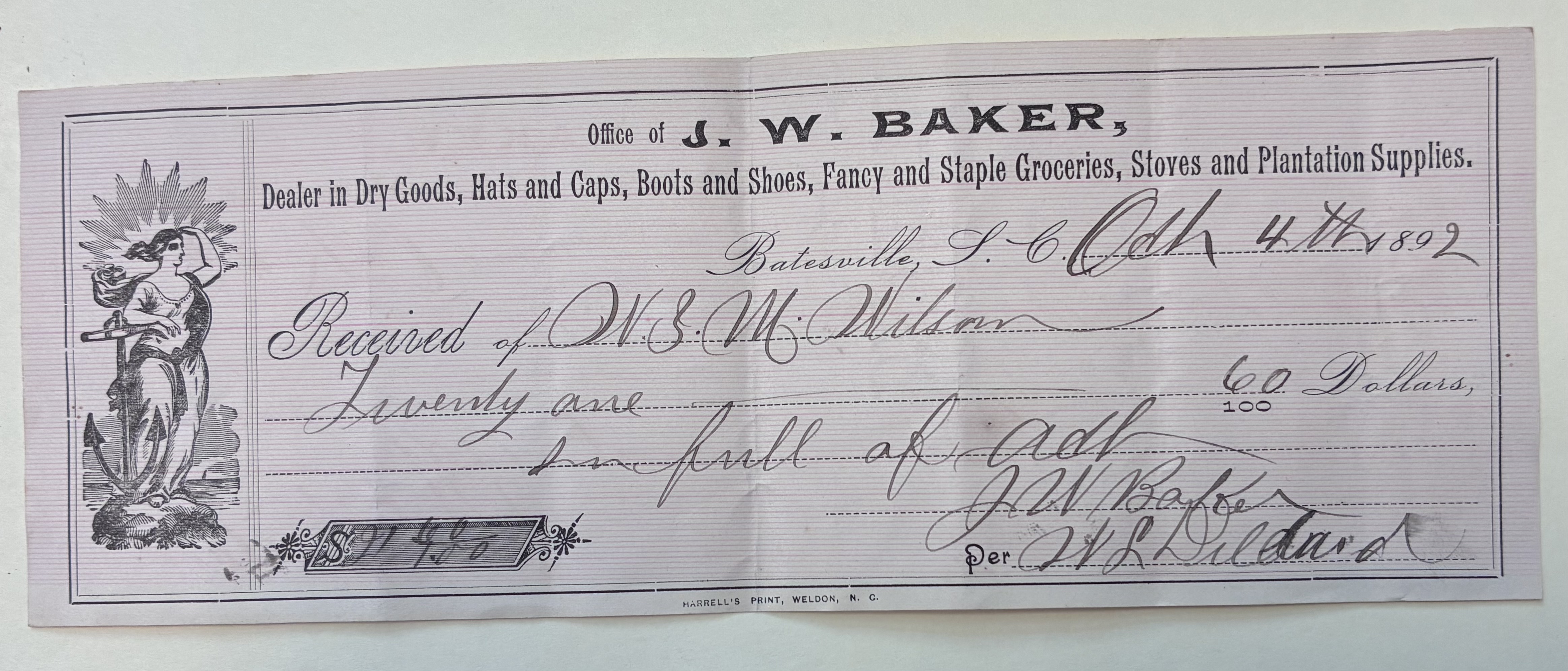 J.W. Baker Check, Batesville, S.C., October 4, 1892