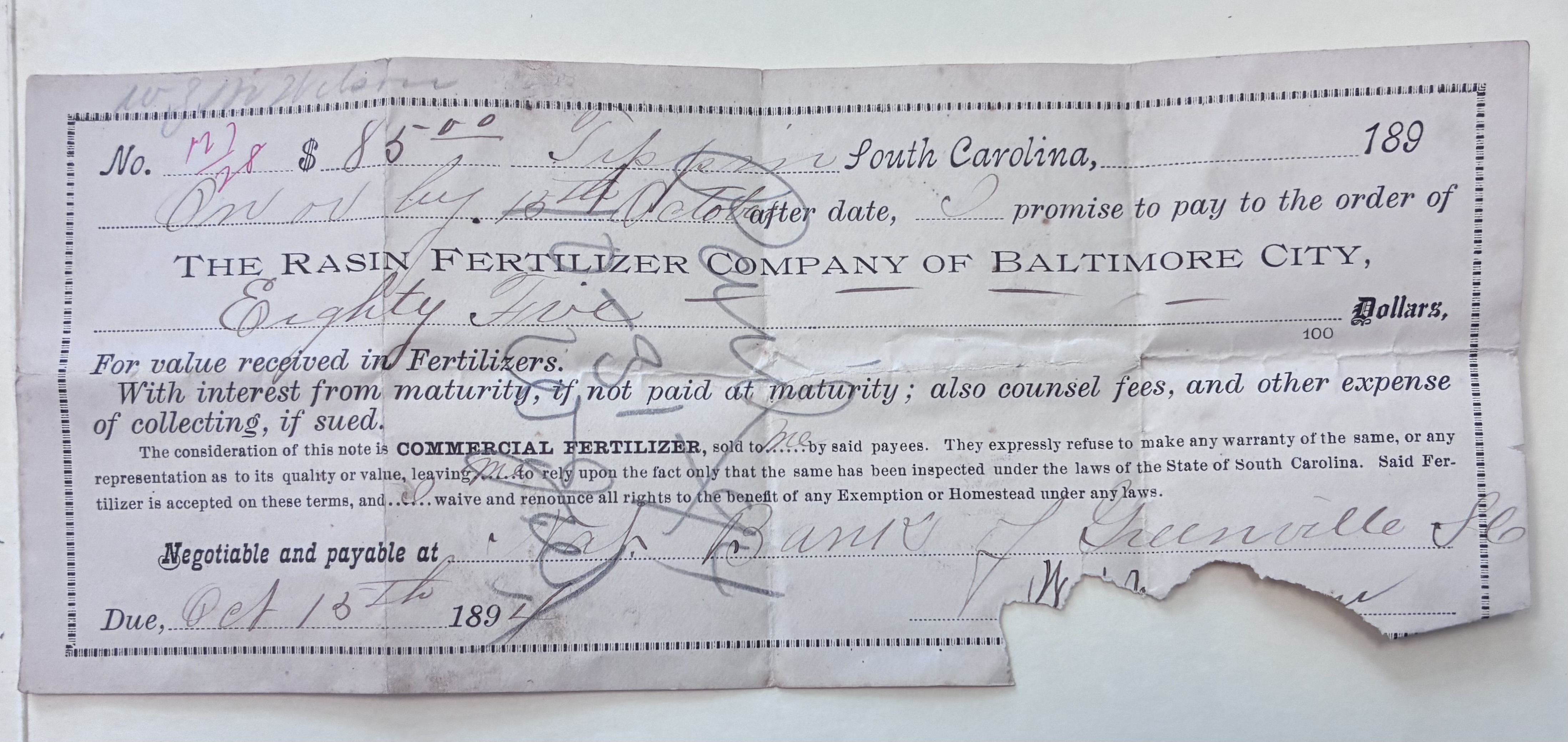 - The Rasin Fertilizer Company of Baltimore City Payment Promise Note, Tippin, S.C., 1894