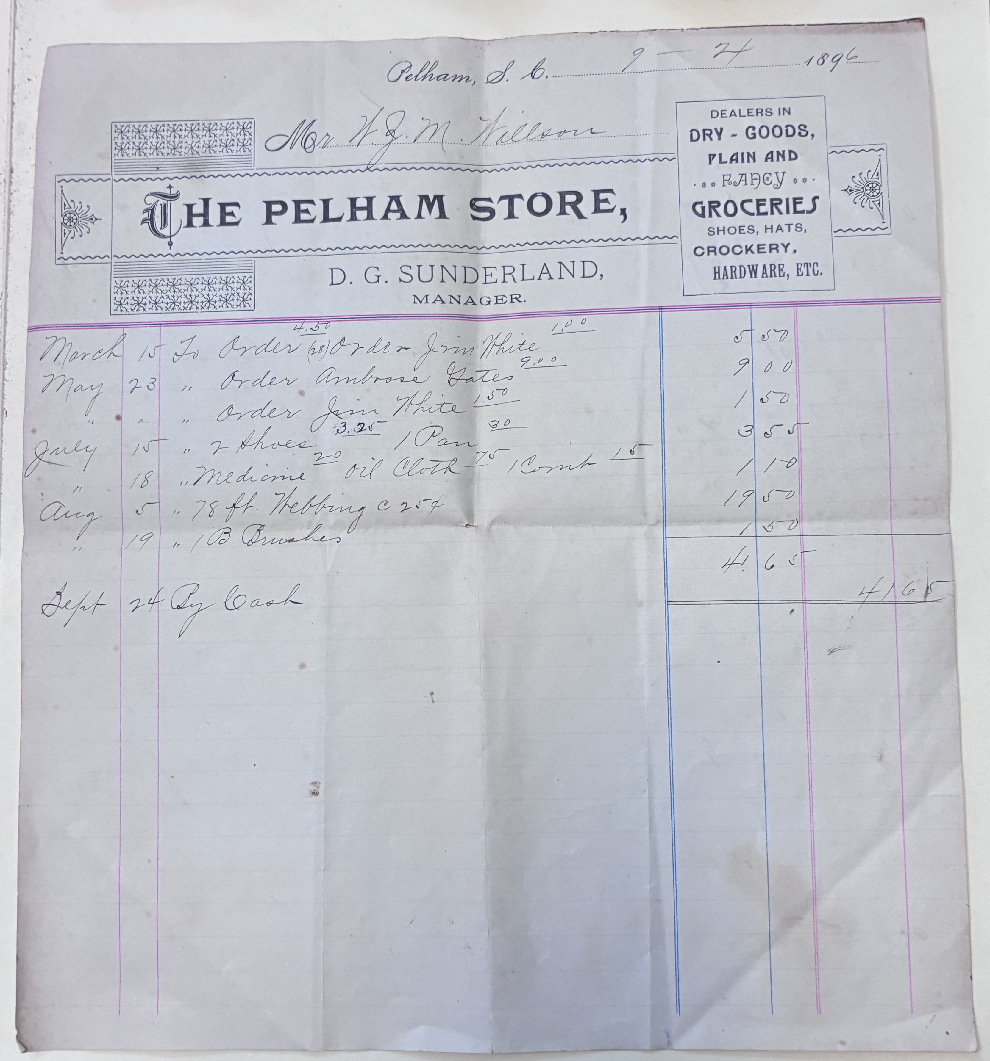 - The Pelham Store Receipt, Pelham, S.C., September 4, 1896