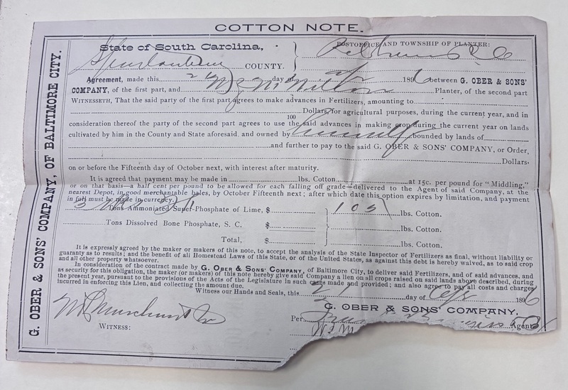 - G. Ober & Sons' Company Lien on Crop Note, Spartanburg, S.C., April 21, 1896