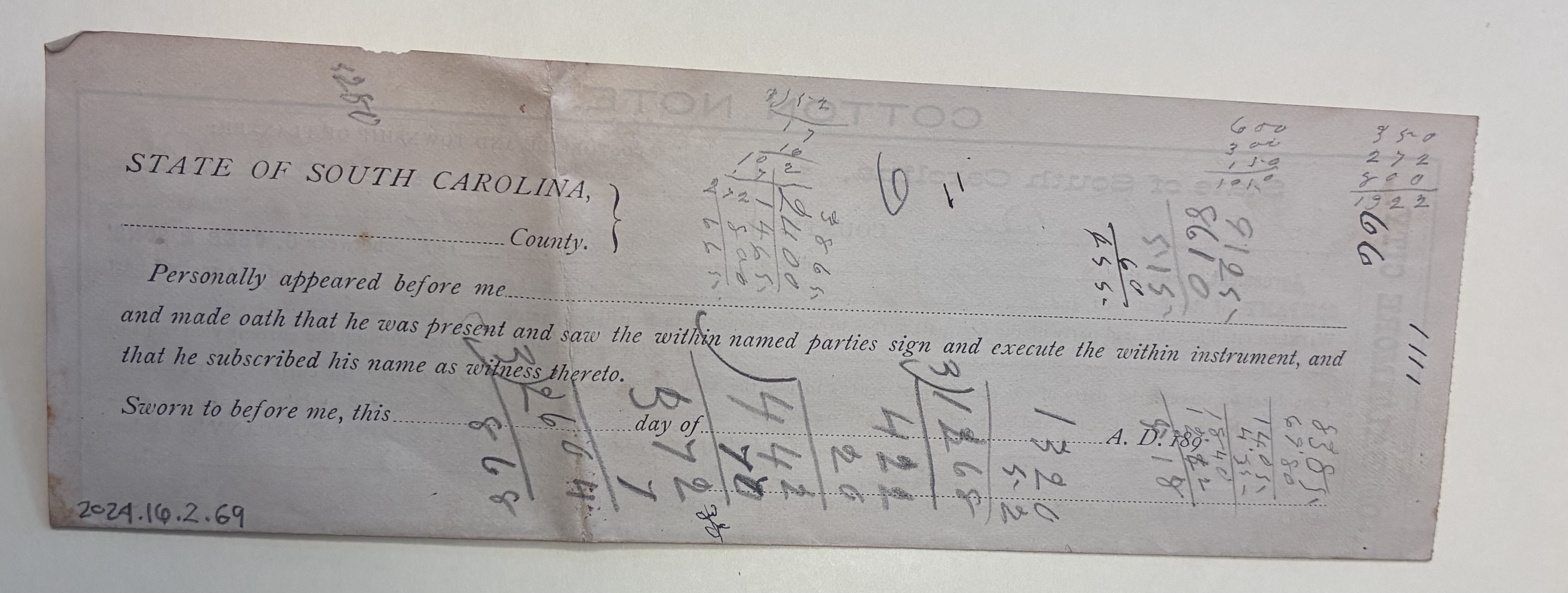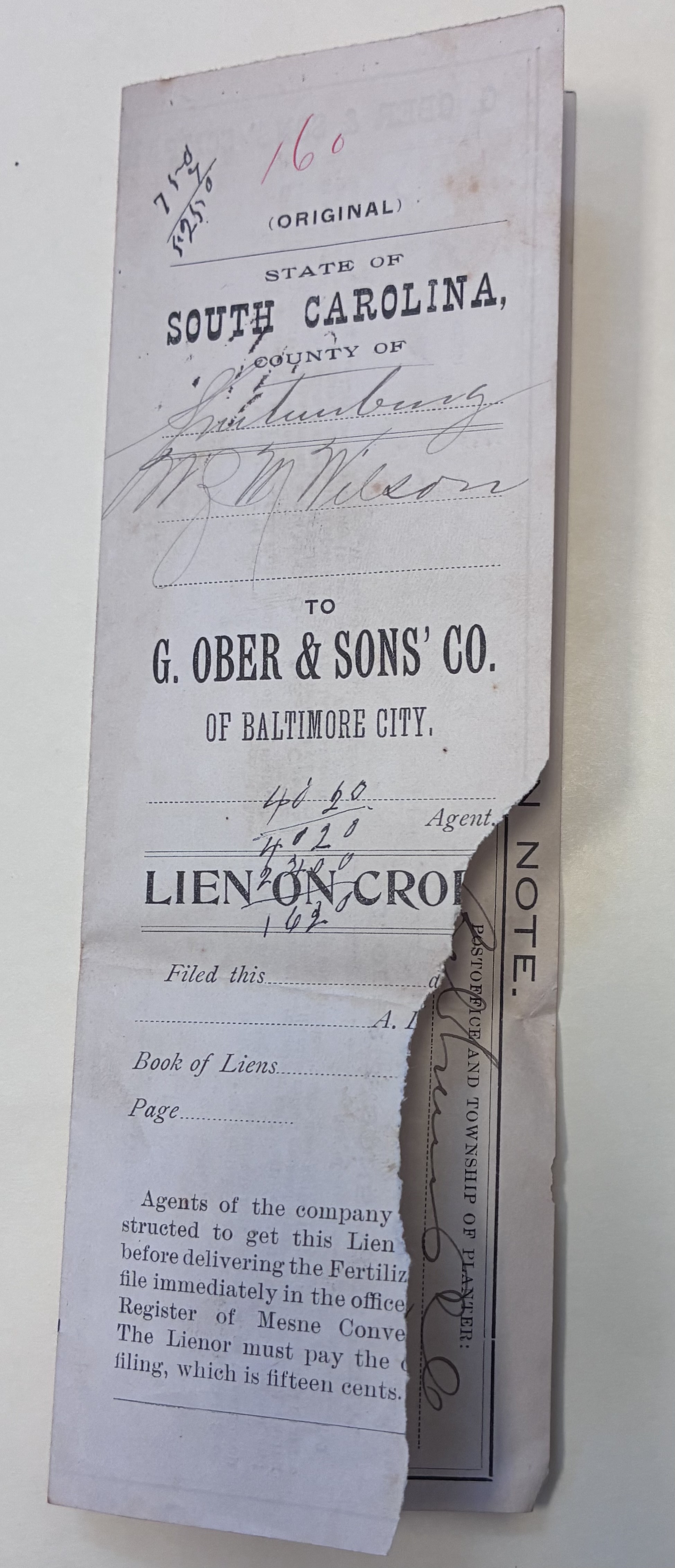 Part of G. Ober & Sons' Company Lien on Crop Note, Spartanburg, S.C., April 21, 1896