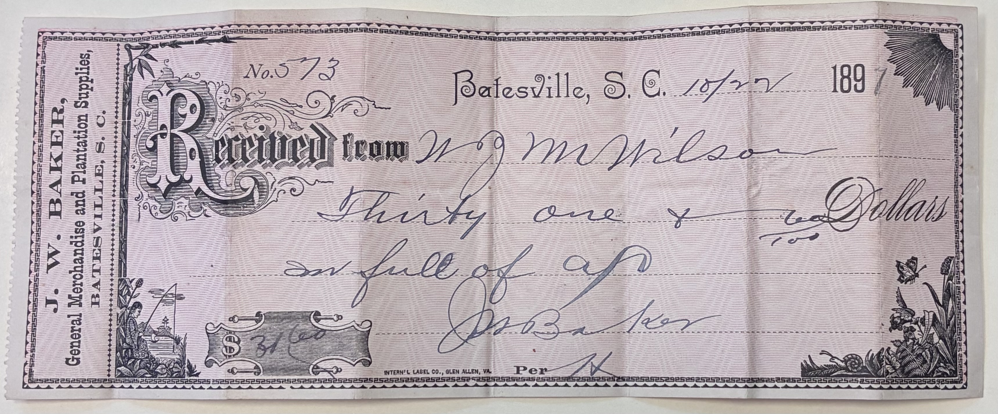 - W.Z.M. Wilson paid $31.60 to J.W. Baker, General Merchandise and Plantation Supplies, Batesville, S.C.