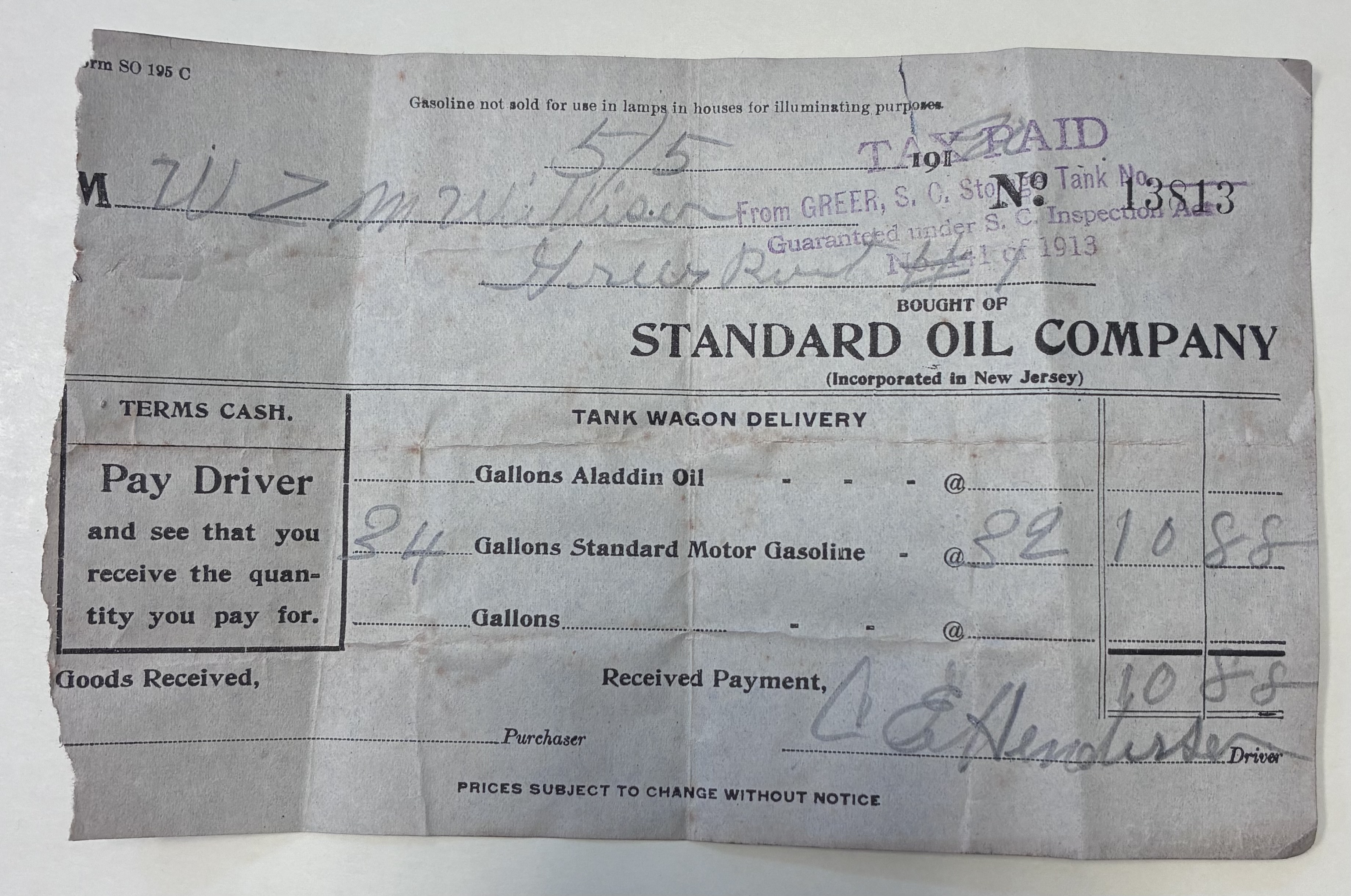 - Standard Oil Company Receipt, Greer, S.C., May 5, 1913