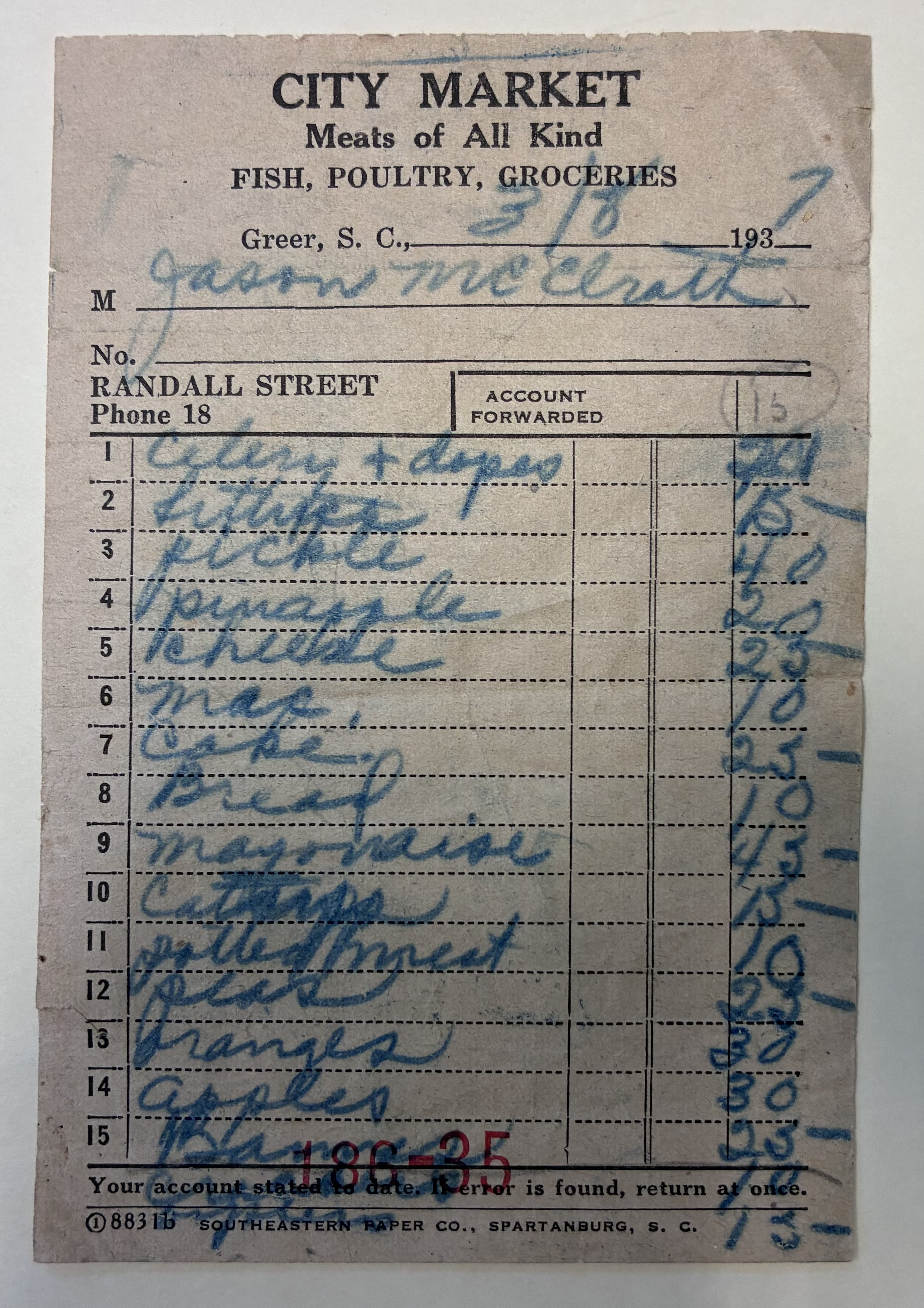 City Market Receipt, Greer, S.C., March 8, 1937