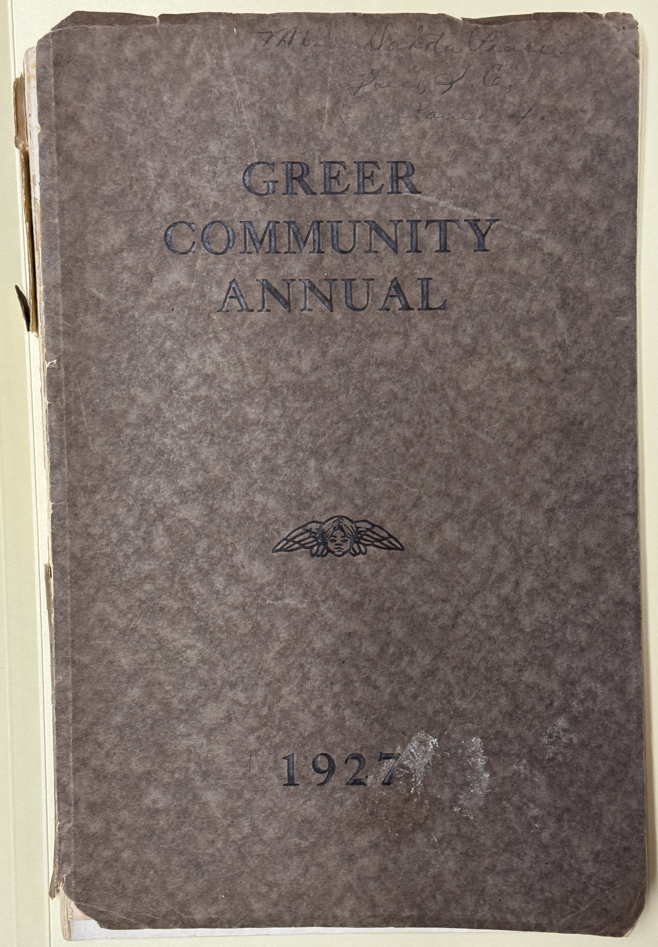 - Book containing history, current 1927 information, photographs of people and buildings, and advertisements about Greer. Handwritten on cover: Mrs. Dakoka Peace, Greer, S.C., Route 4. This book was given to the donor's aunt Elizabeth Wilson Peace by Dakota Peace; previously owned by Gerald Peace, son of Elizabeth.