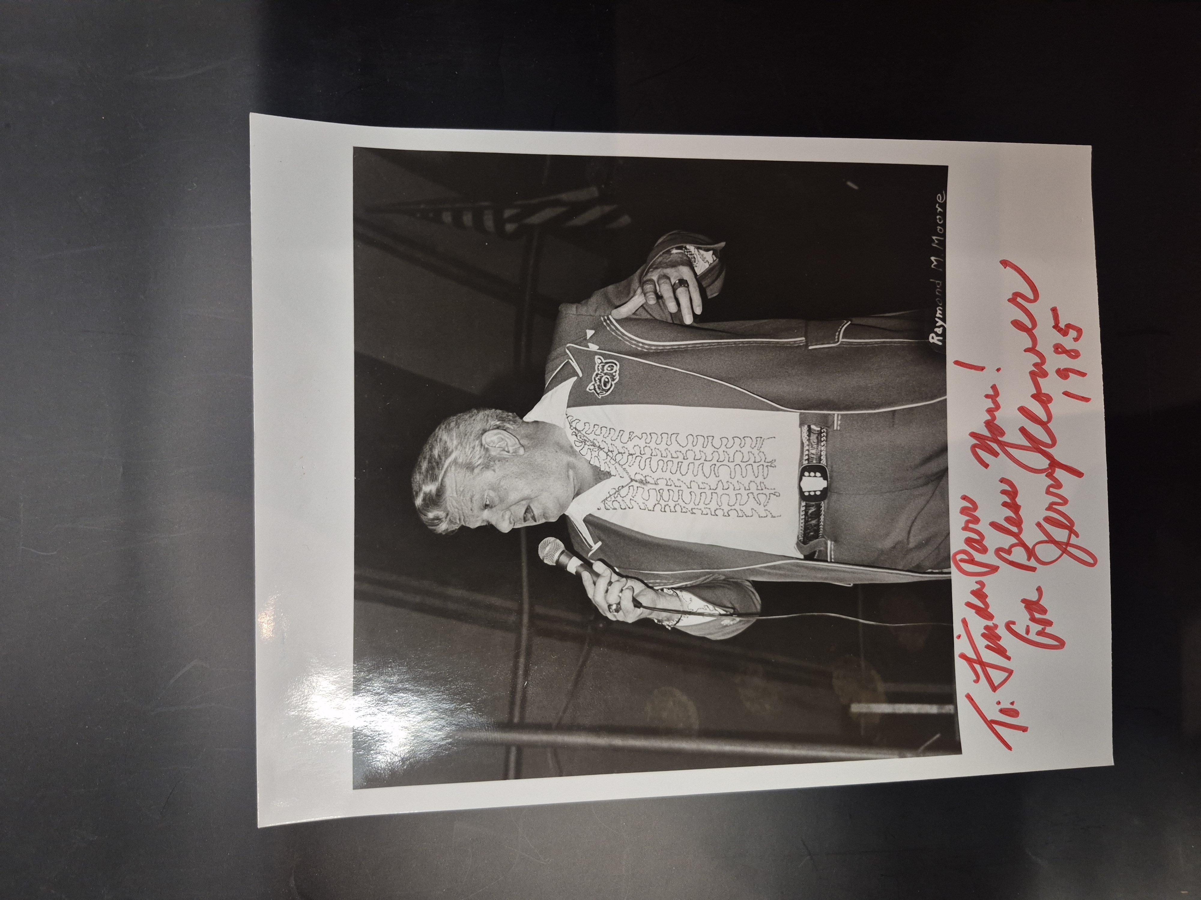 - Photograph of Jerry Clower. Signed in red marker: "To: Linda Parr, God Bless You! Jerry Clower 1985"