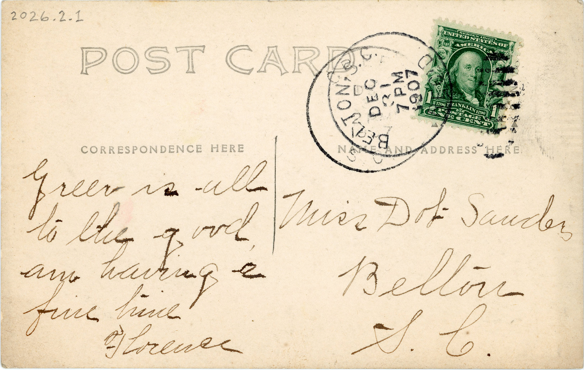 - The postmark is December 31, 1907. The photograph shows trees in full leaf, so was taken prior to Fall 1907.