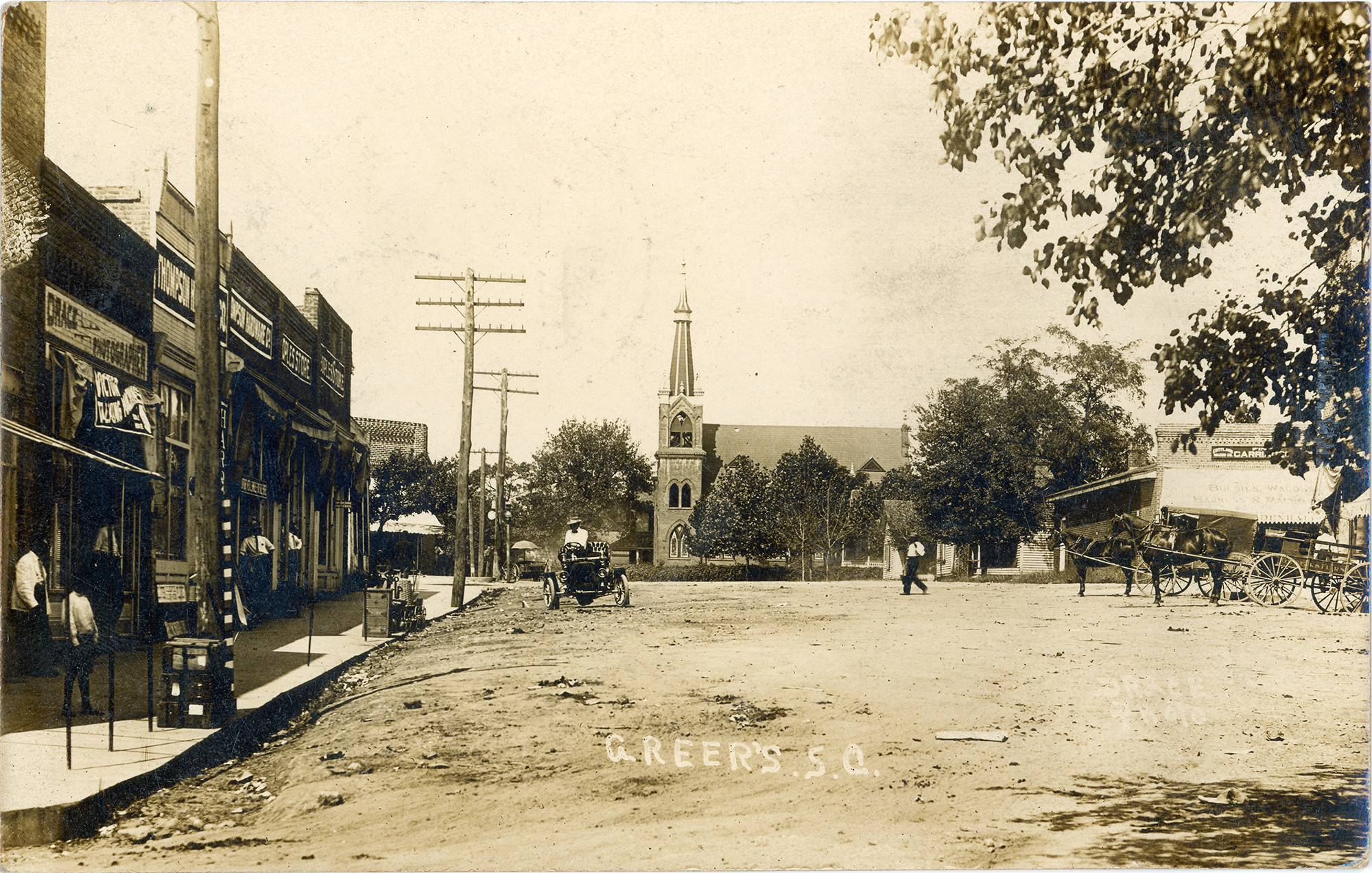 - Original silver gelatin photograph made into a postcard. Camera was positioned in the street at the corner of Trade and (now) Poinsett, looking toward Main Street. In the center of the photo is the newly-built Greer's First Baptist Church; to the right is the Wood-Mendhall carriage shop; to the left is Drace's photo studio, Thompson Hardware, and the People's store. In the street there are two wagons and horses, a man walking, and an early brass-era automobile—a Cadillac, Buick, or similar touring car from around 1905–1907. One of the wagons is labeled "Greers Furniture," which was located just out of frame to the right.