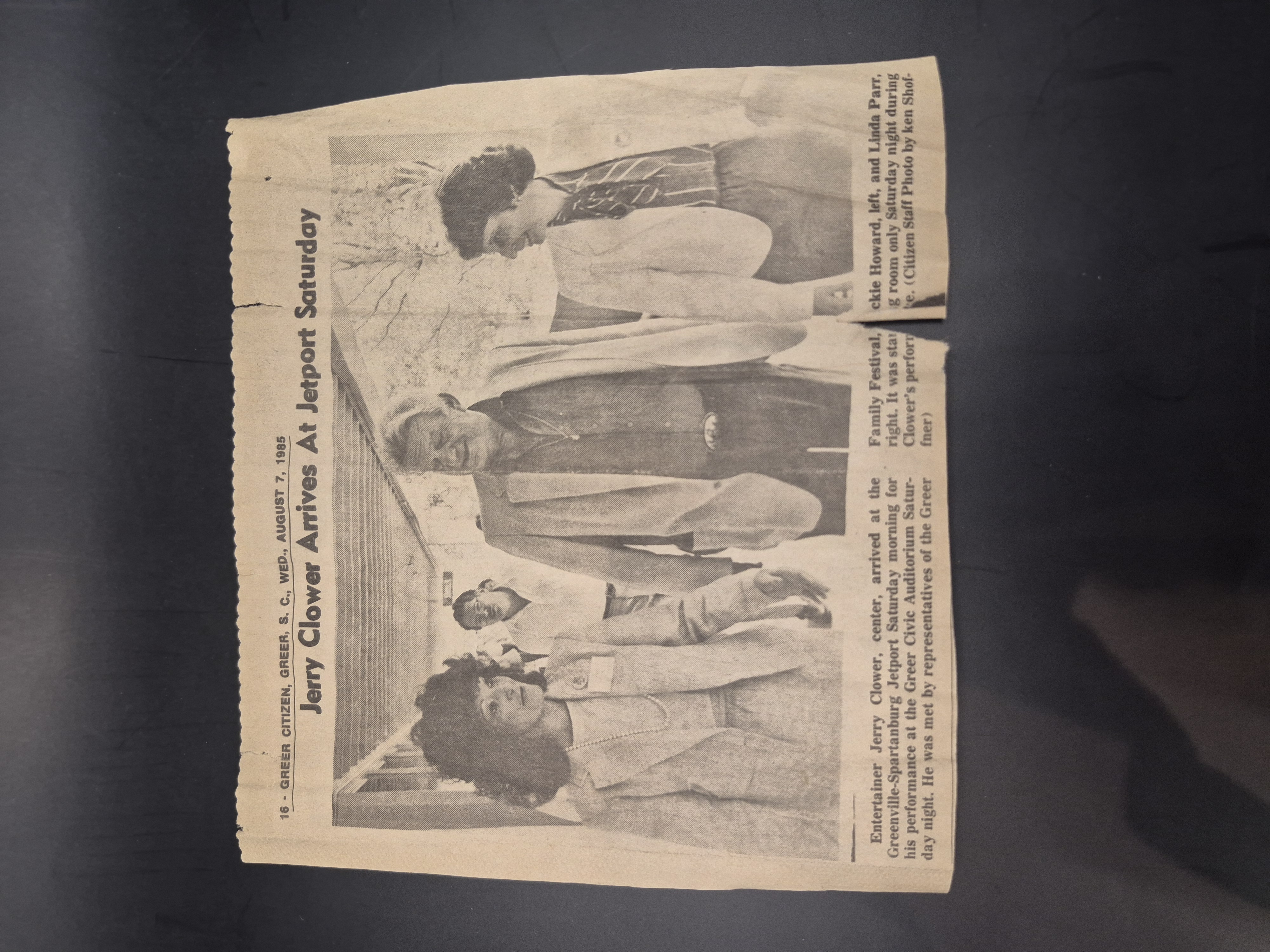 - Clipping from the Greer Citizen issued for Wednesday, August 7, 1985. Printed is a photograph of Jerry Clower with Jackie Howard (left) and Linda Parr (right). The text references the first Greer Family Festival.