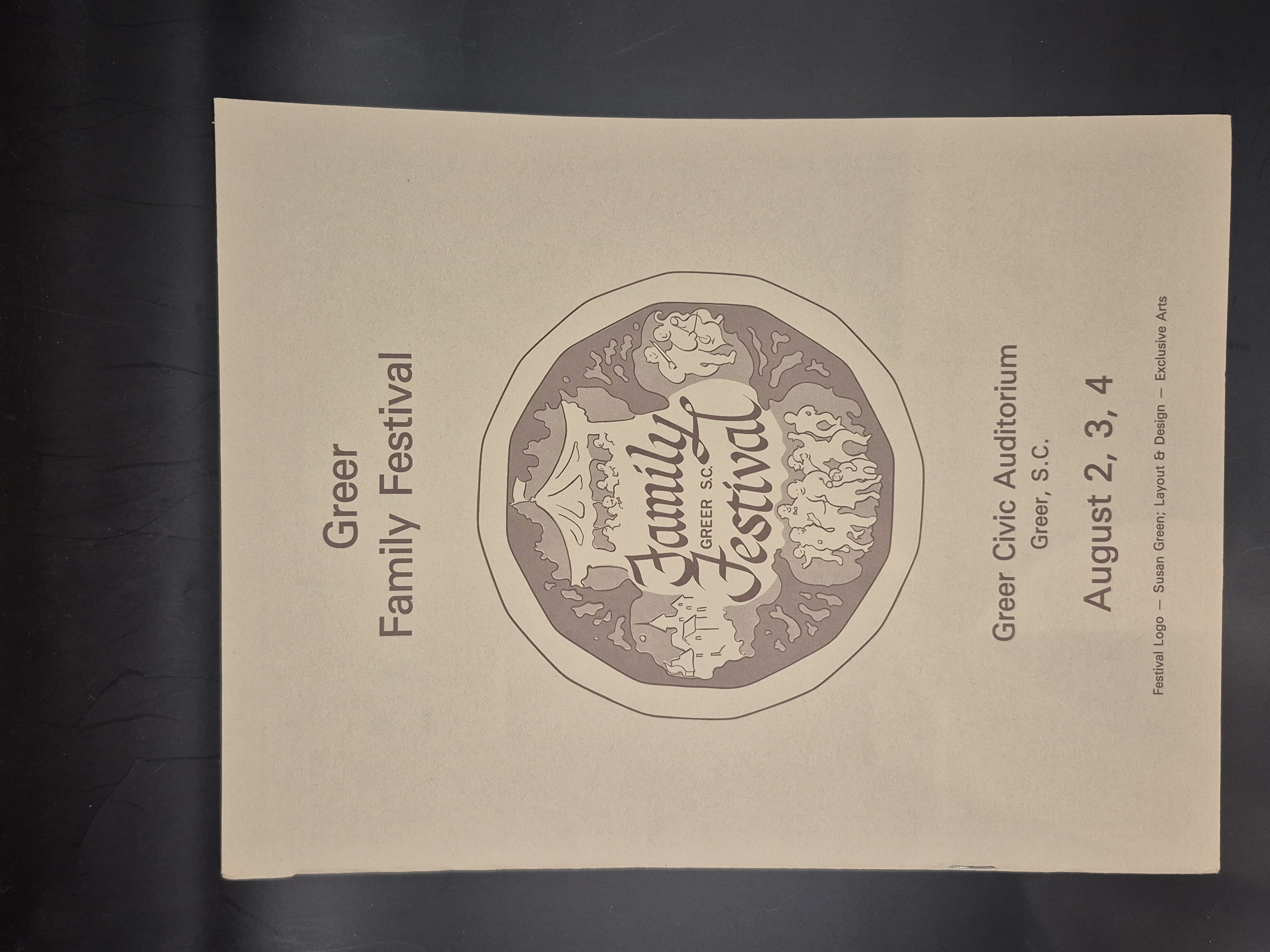 - Program from the first Greer Family Festival held on August 2-4 1985. Pages include the festival schedule, local advertisements, and Greer history and information related to buildings, companies, and influential people.