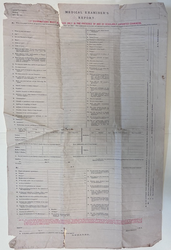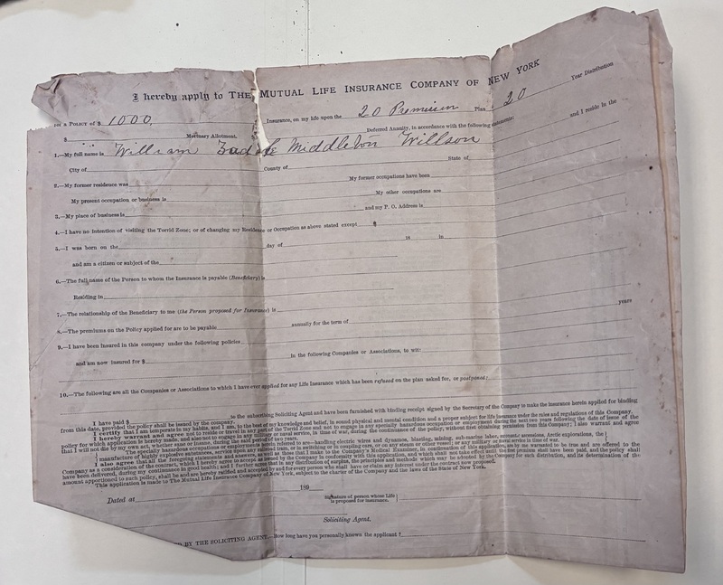 - William Zadok Middleton Willson's application for a $1000 insurance policy with the Mutual Life Insurance Company of New York