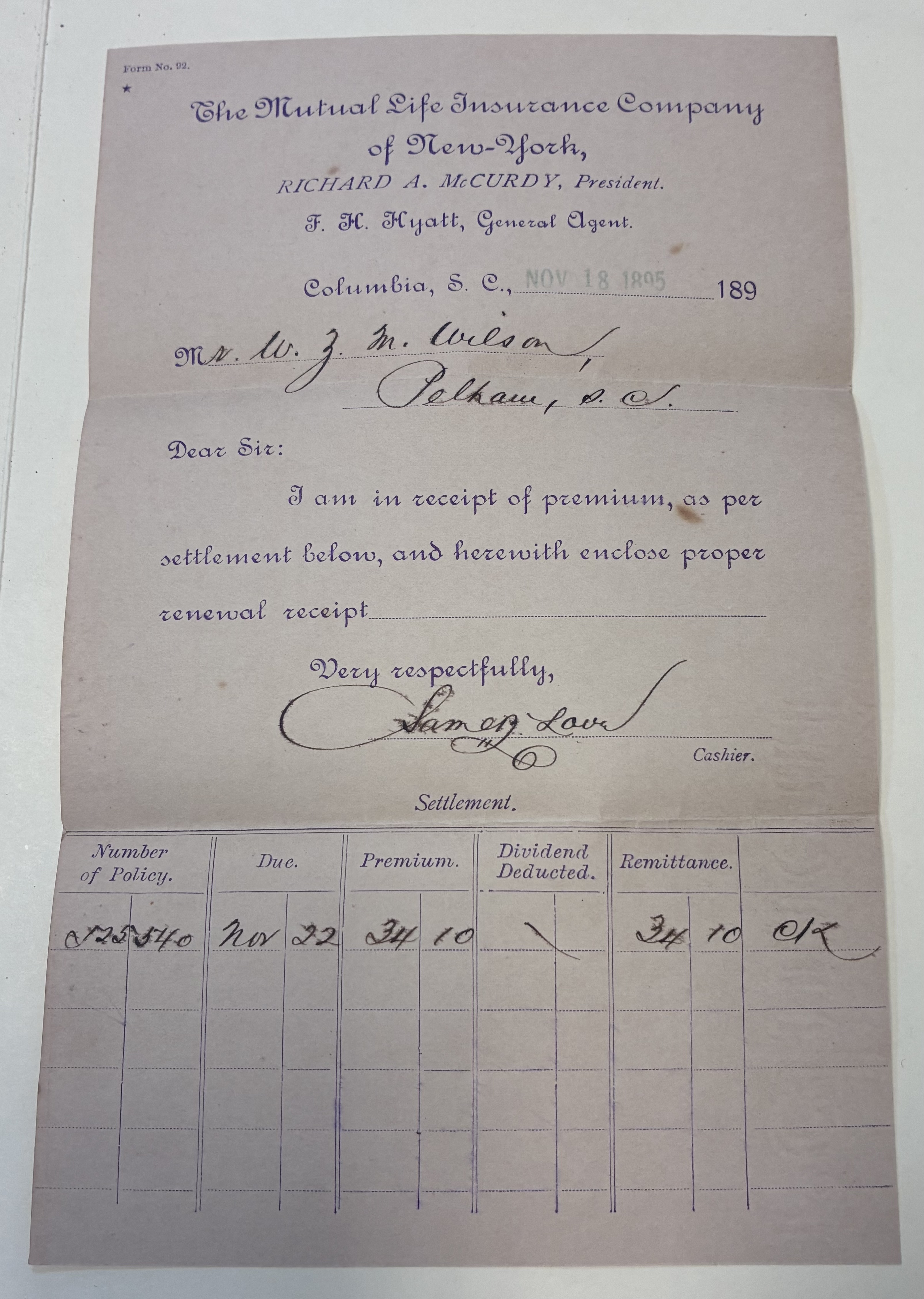 - Mutual Life Insurance Company of New York Receipt Letter, Columbia, S.C., November 18, 1895