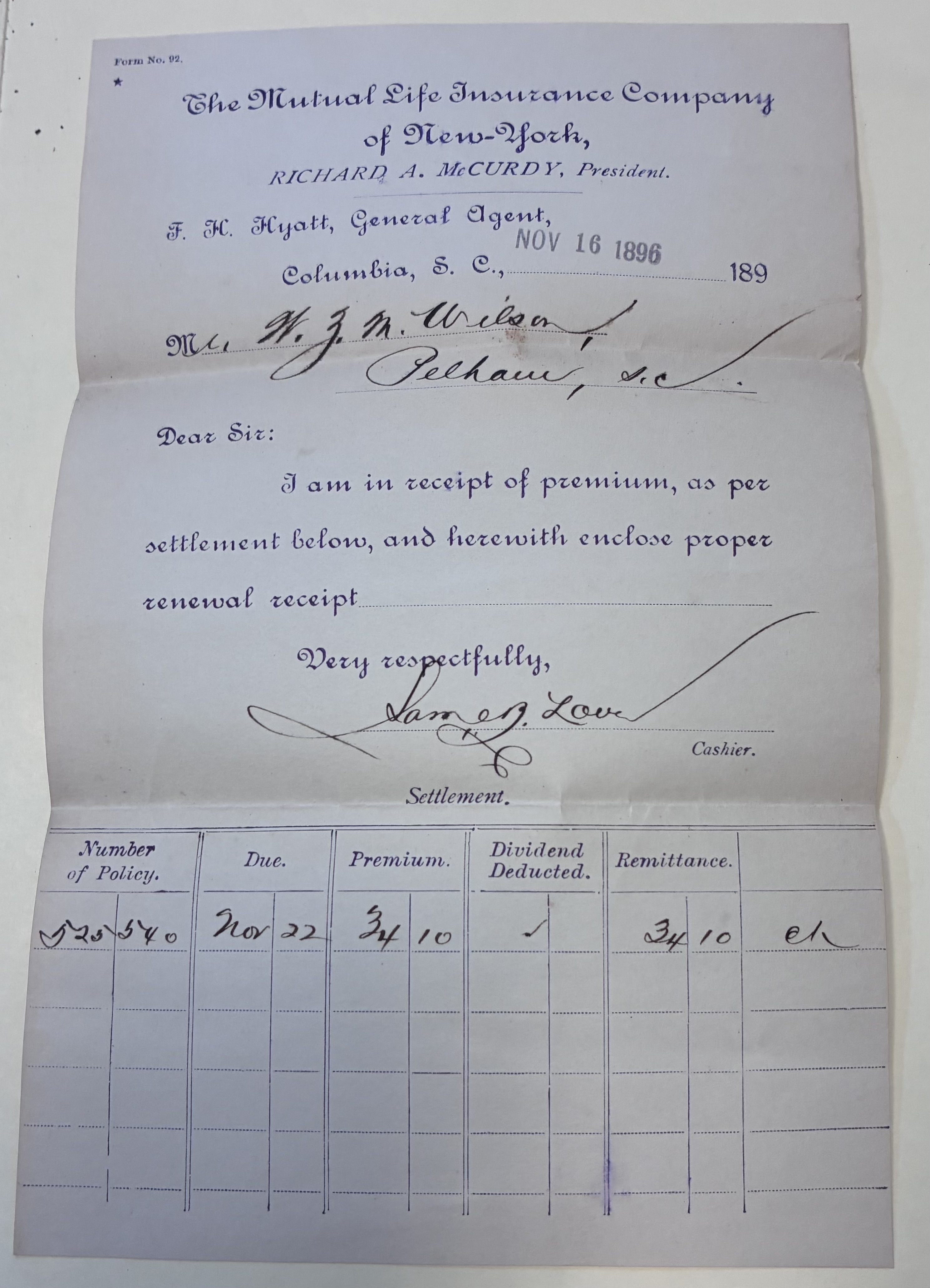 - Mutual Life Insurance Company of New York Receipt Letter, Columbia, S.C., November 16, 1896