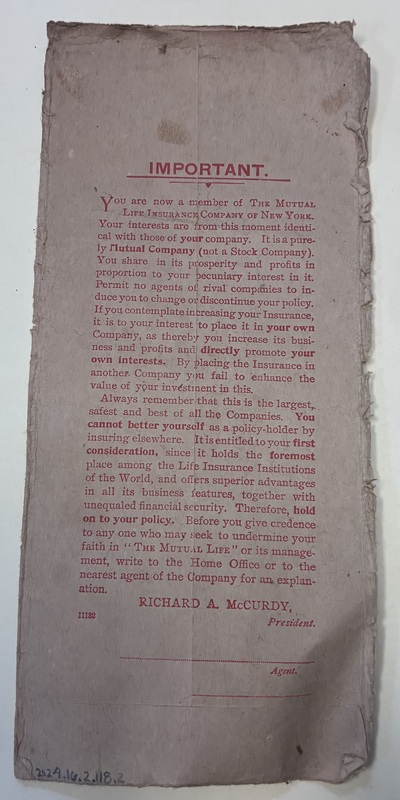 Part of Two Mutual Life Insurance Company of New York Envelopes, 1912 & 1913