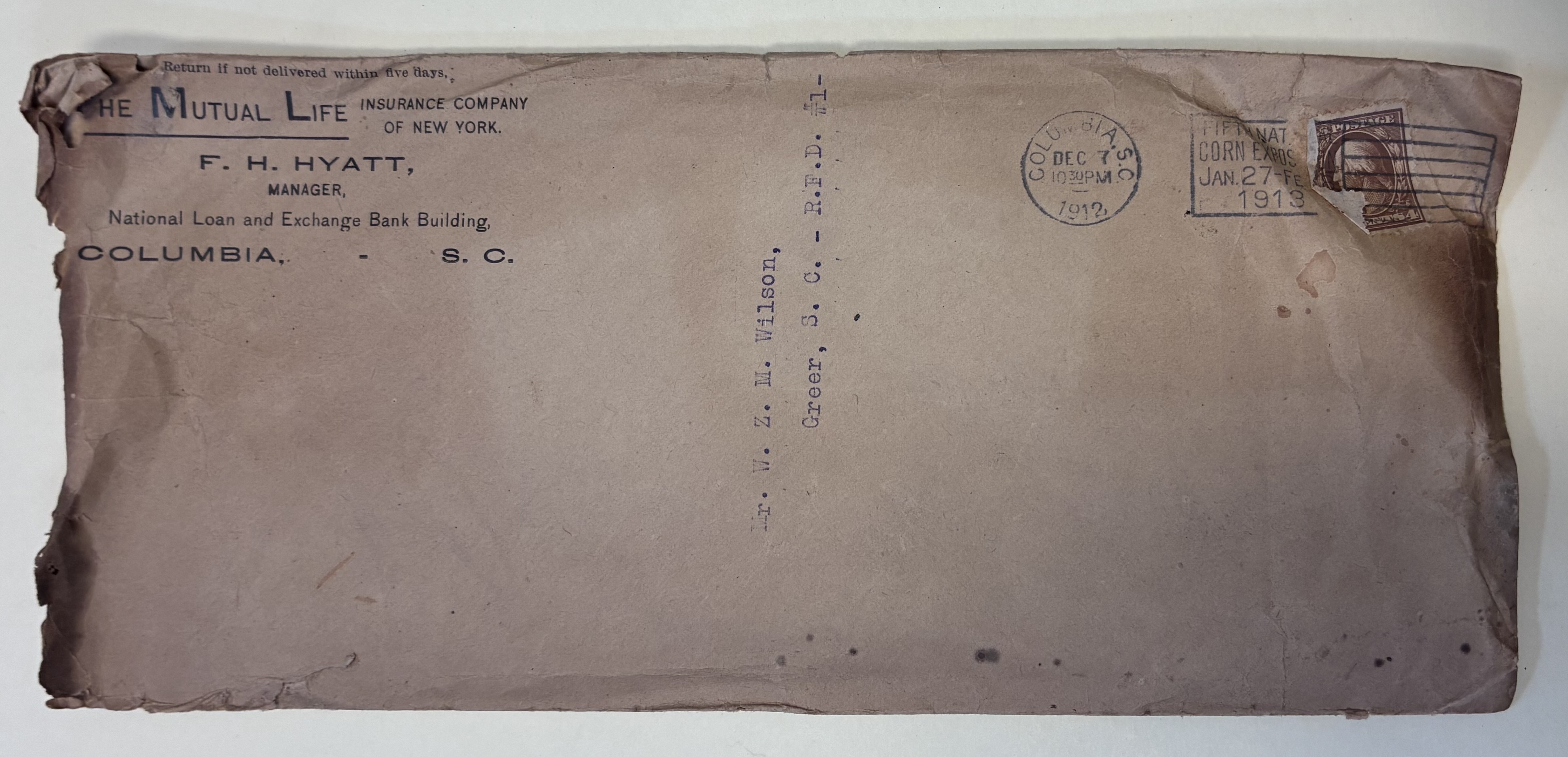 1: Envelope from F.H. Hyatt, Manager, the Mutual Life Insurance Company of New York to Mr. W.Z.M. Wilson, Greer, S.C.