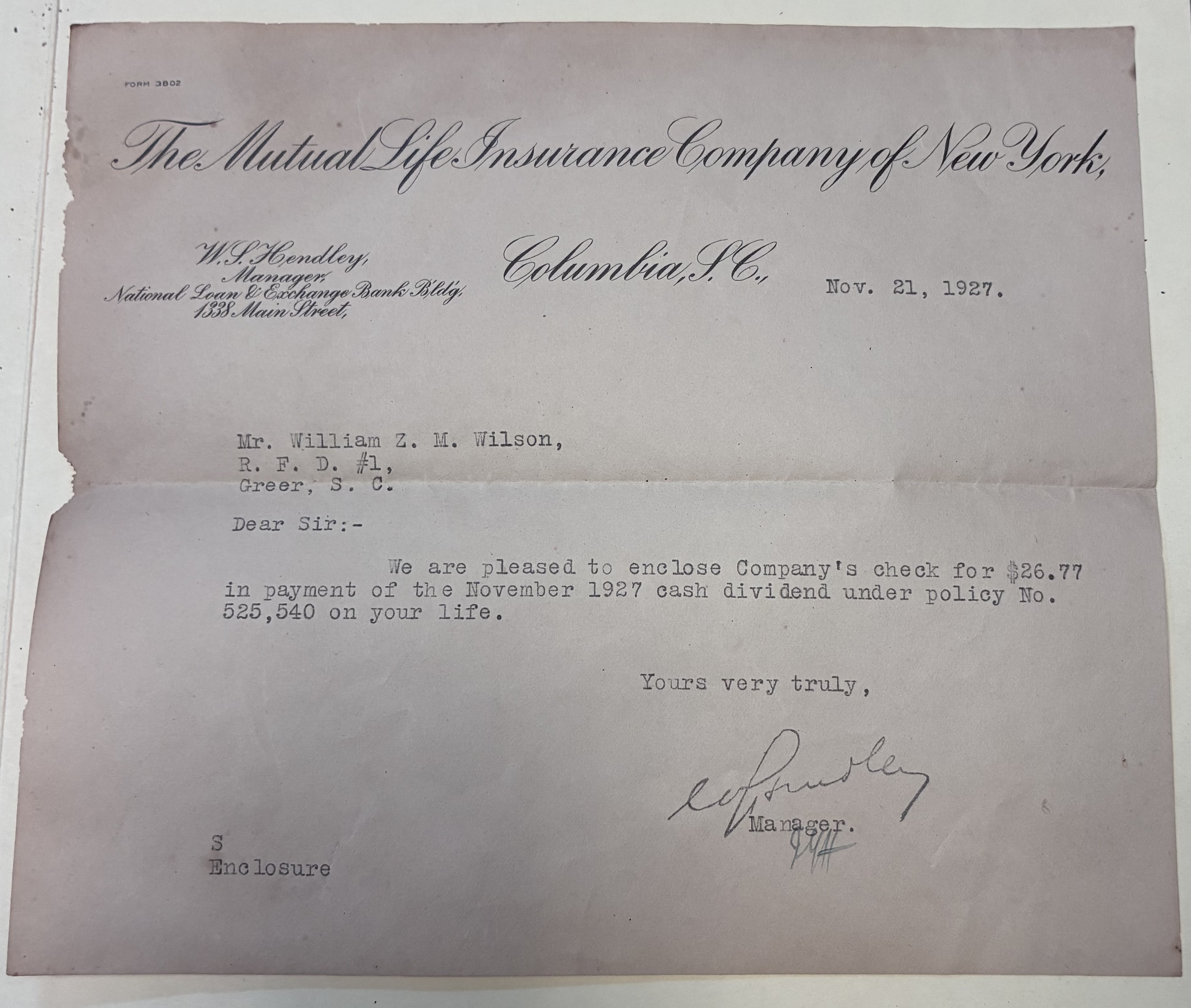 - Mutual Life Insurance Company of New York Letter, Columbia, S.C., November 21, 1927