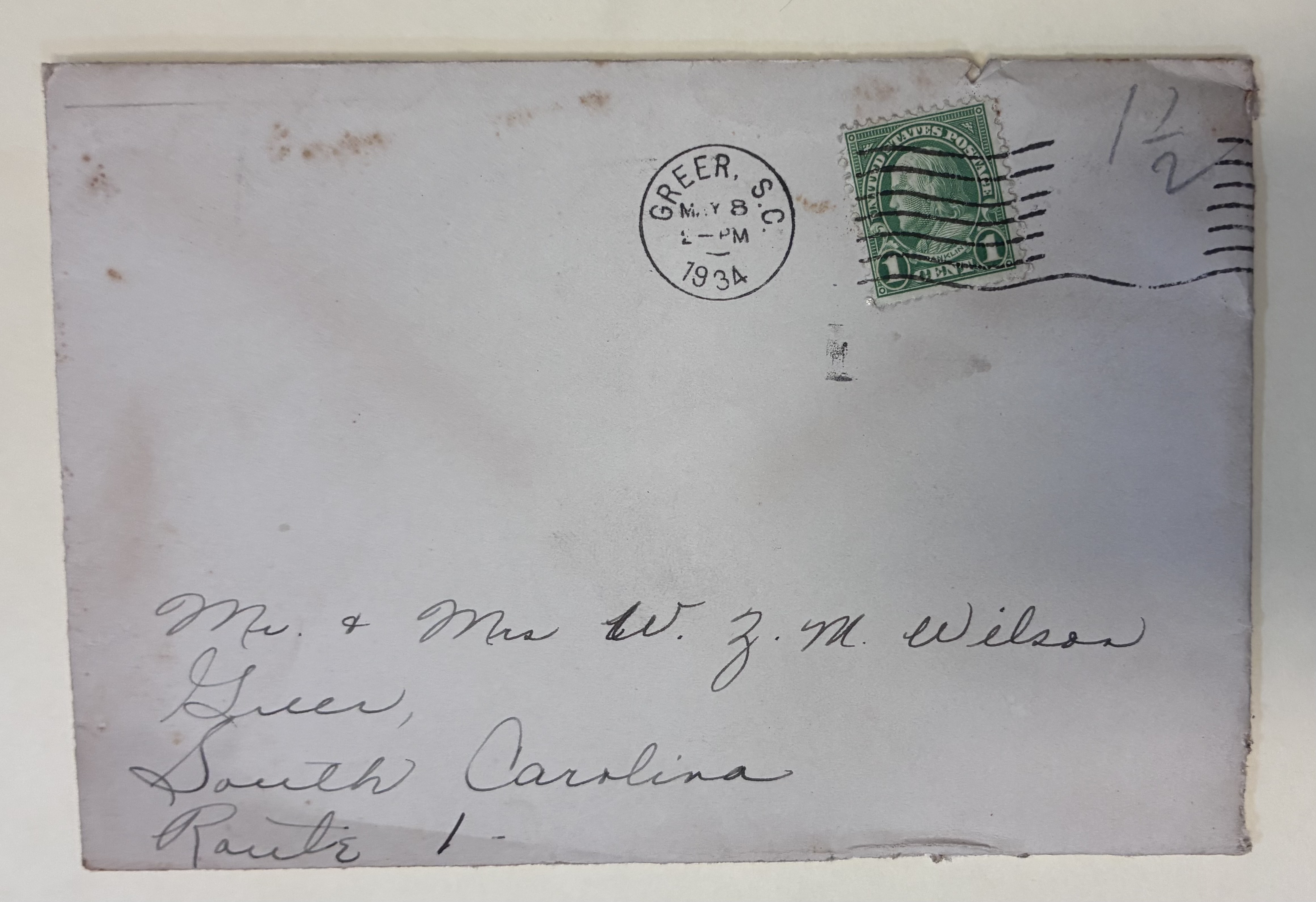 - Mr. and Mrs. W.Z.M. Wilson Envelope, Greer, S.C., May 8, 1934