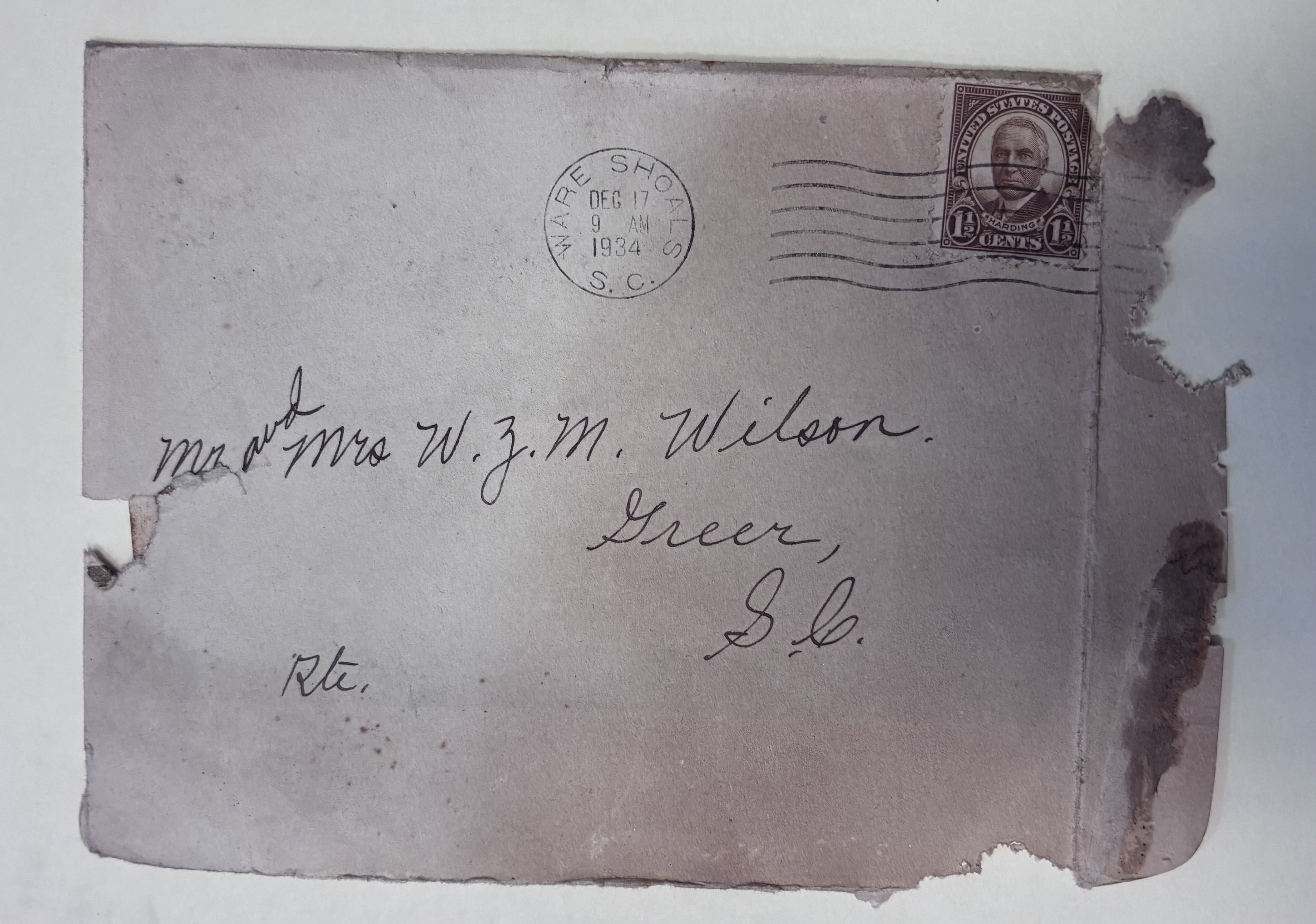Part of Mr. and Mrs. W.Z.M. Wilson Envelope, Ware Shoals, S.C., December 17, 1934