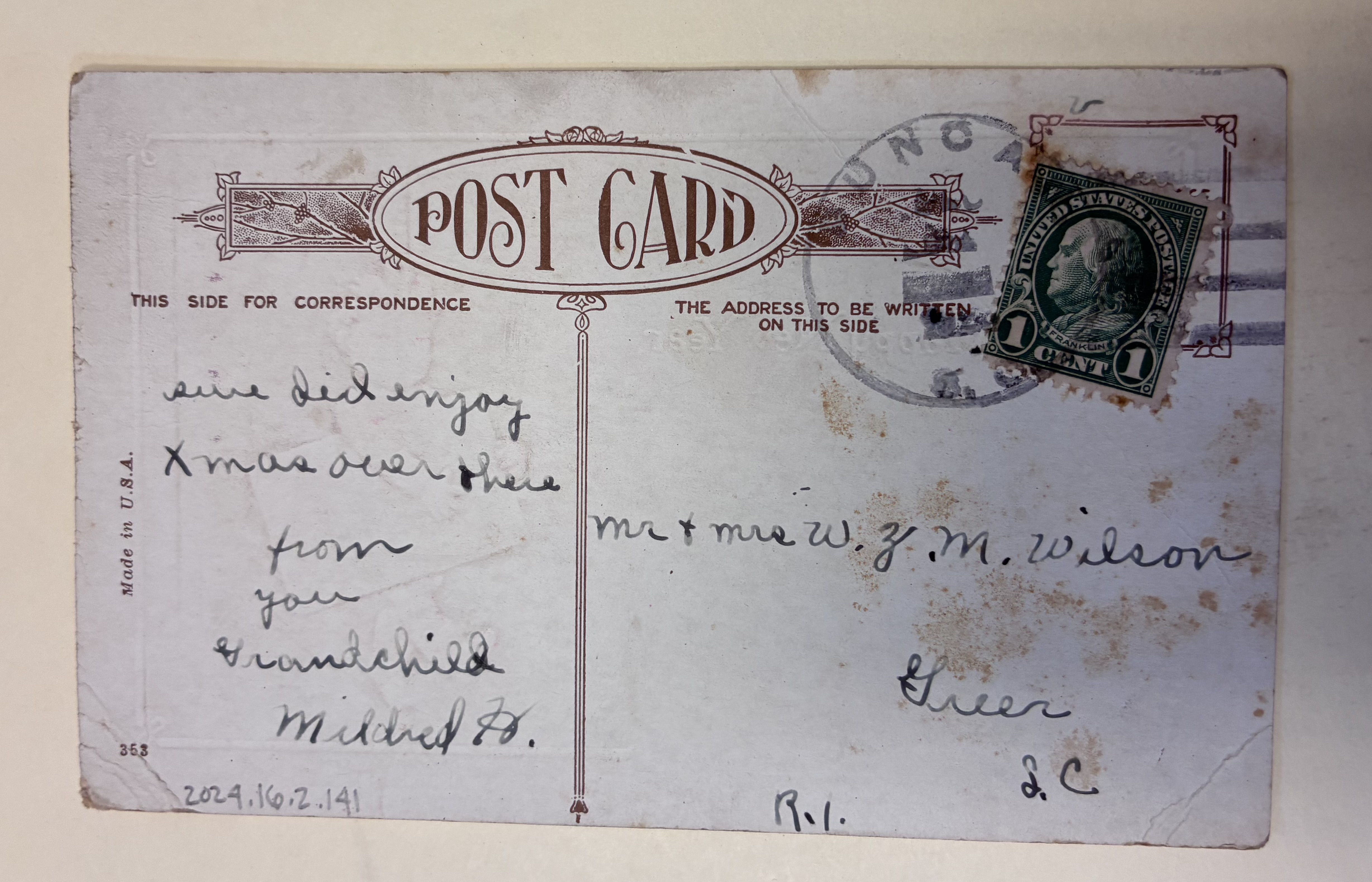 Back: we did enjoy Xmas over there from your grandchild Mildred A.