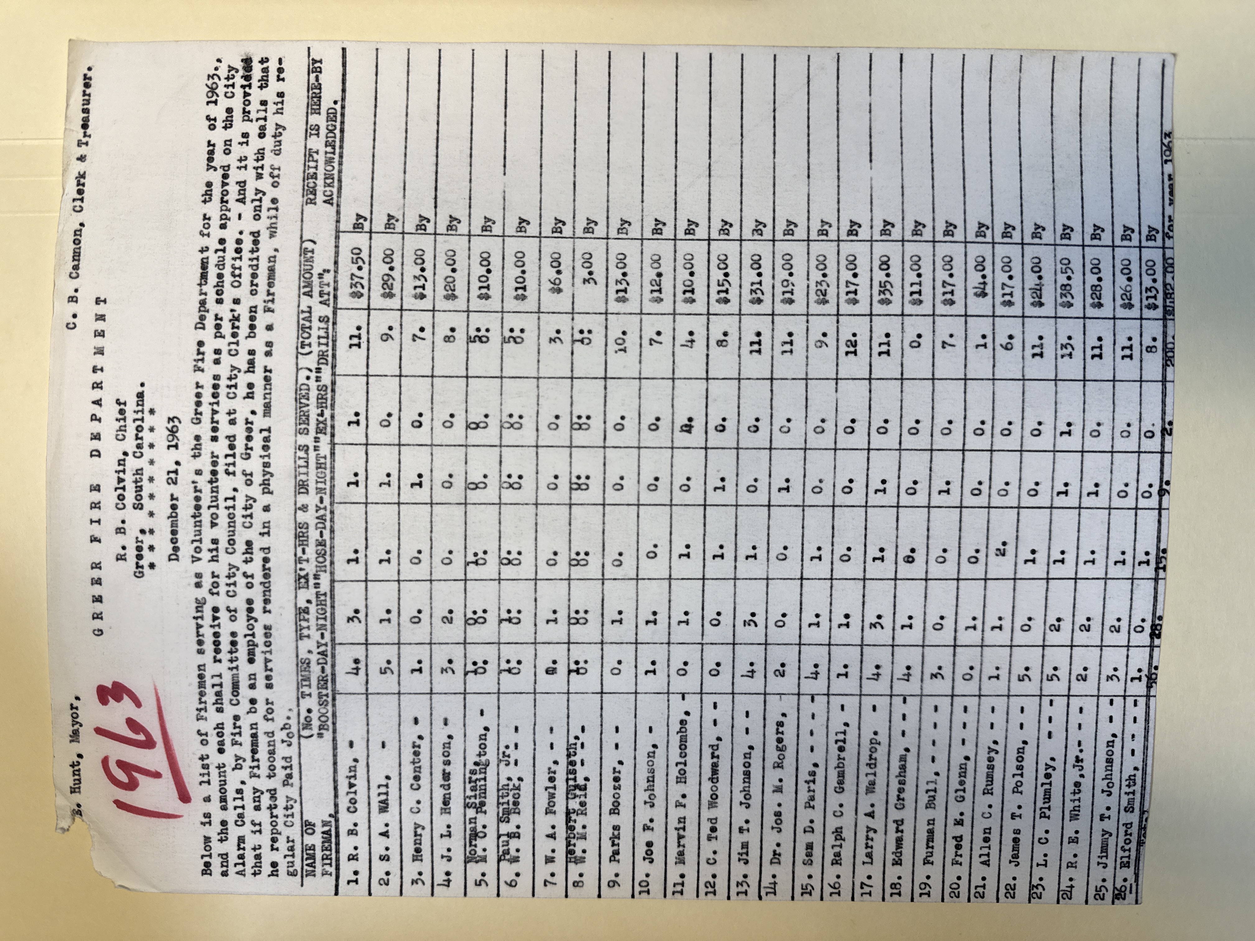 Report with "a list of Firemen serving as Volunteer's in the Greer Fire Department for the year of 1963."