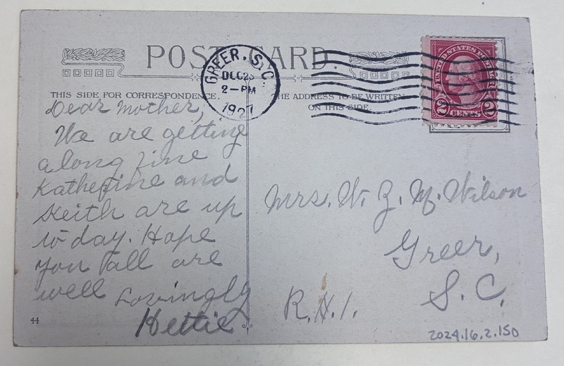 - Christmas postcard from Hettie to Mrs. W.Z.M. Wilson, Greer, SC