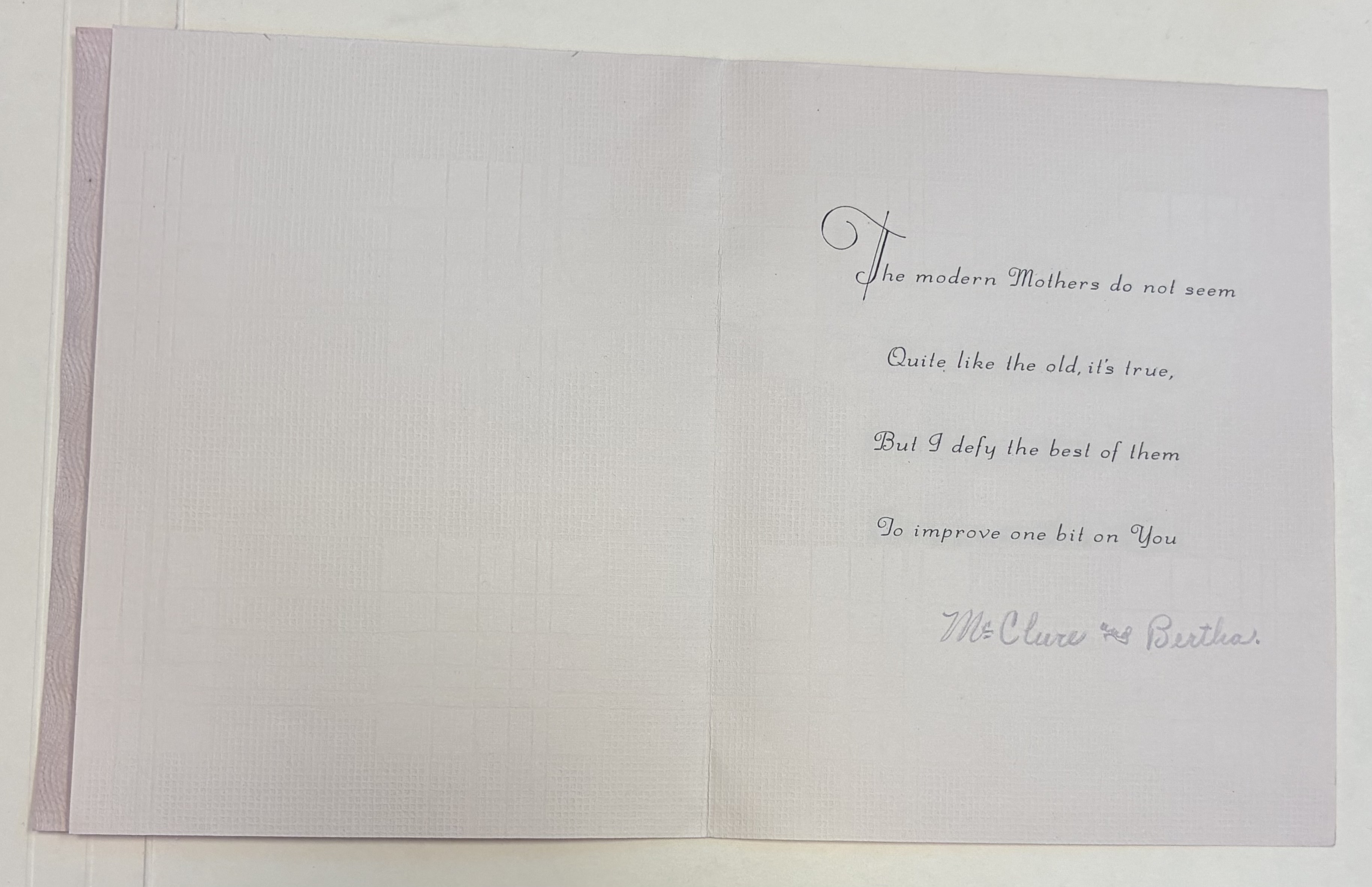 Inside: The modern Mothers do not seem Quite like the old, it's true, But I defy the best of them To improve one bit on You McClare and Bertha
