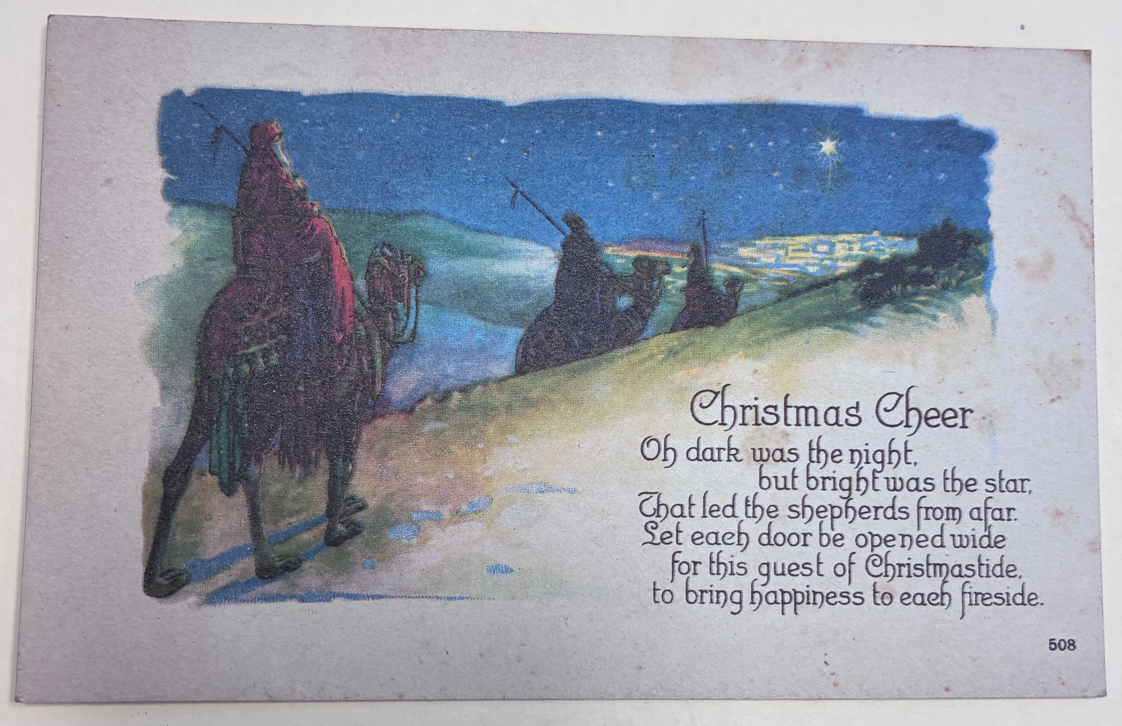 Oh dark was the night, but bright was the star. That led the shepherds from afar. Set each door be opened wide for this quest of Christmastide, to bring happiness to each fireside.