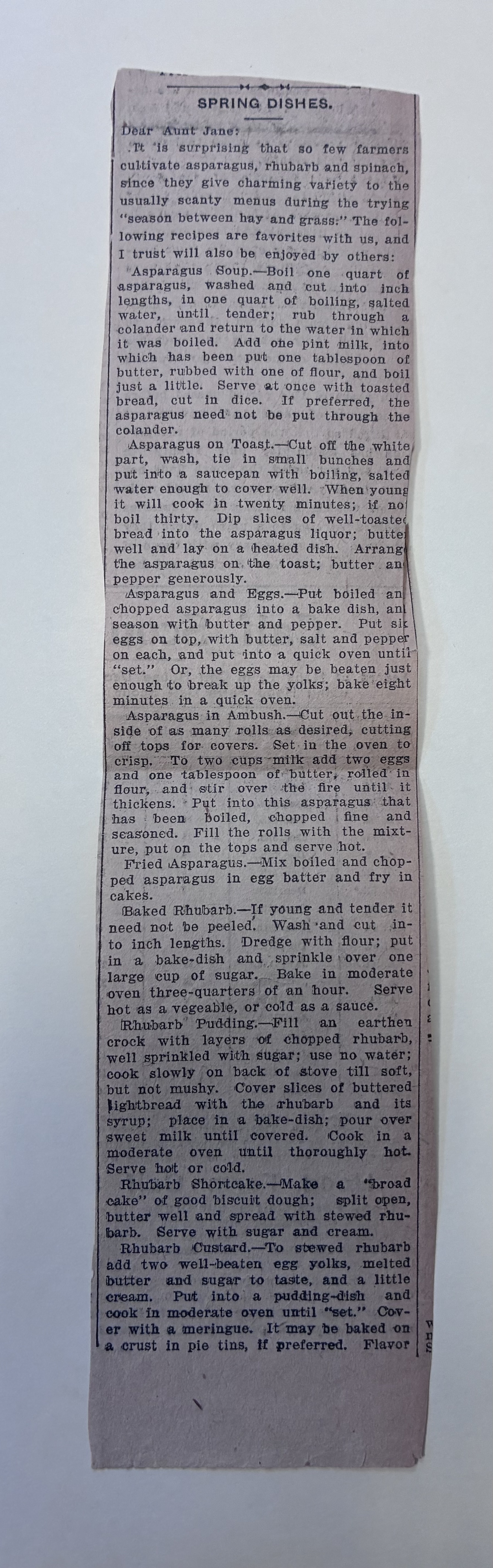 It is surprising that so few farmers cultivate asparagus, rhubarb and spinach, since they give charming variety to the usually scanty menus during the trying "season between hay and grass." The following recipes are favorites with us, and I trust will also be enjoyed by others: