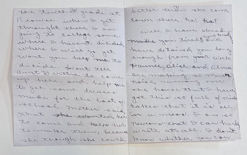the tenth grade at Keowee. When I get throught there I am going to college some-where I haven't dicided where I will go yet. Won't you help me to dicide, wont tell aunt Bertha to come up here and help me to het some dresses made for the last of school. Mother said that she wanted her to come and keep her to make them, because she though she could
