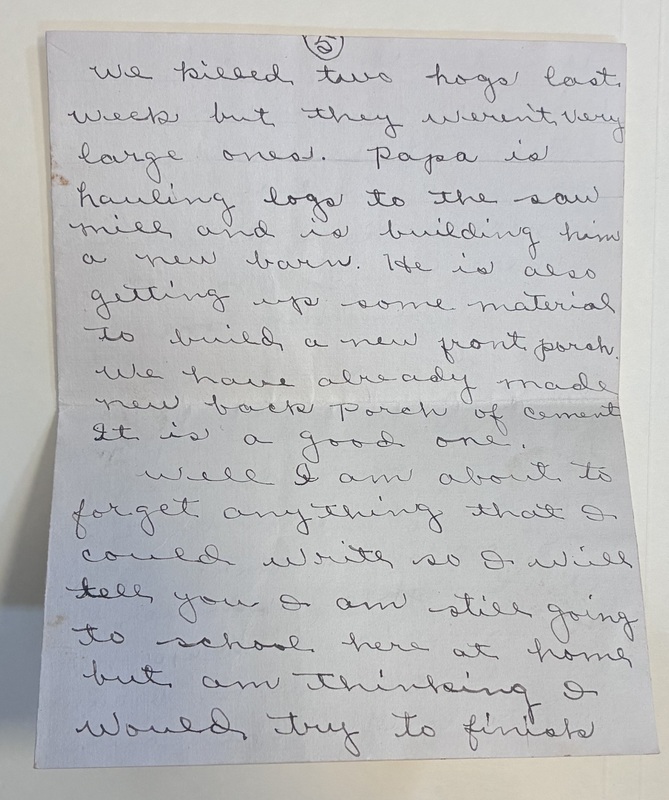 we killed two hogs lask week but they weren't very large ones. Papa is hauling logs to the saw miil and is building him a new barn. He is also getting up some material to build a new front porch. we have already made new back porch of cement it is a good one.