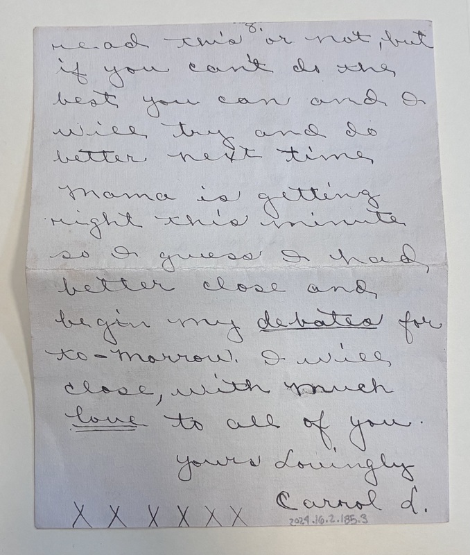 read this or not, but if you can't do the best you can and I will try and do better next time Mama is getting right this minute so I guess I had better close and begin my debates for to-morrow. I will close, with much love to all of you. Your Lovingly XXXXXX Carol d.