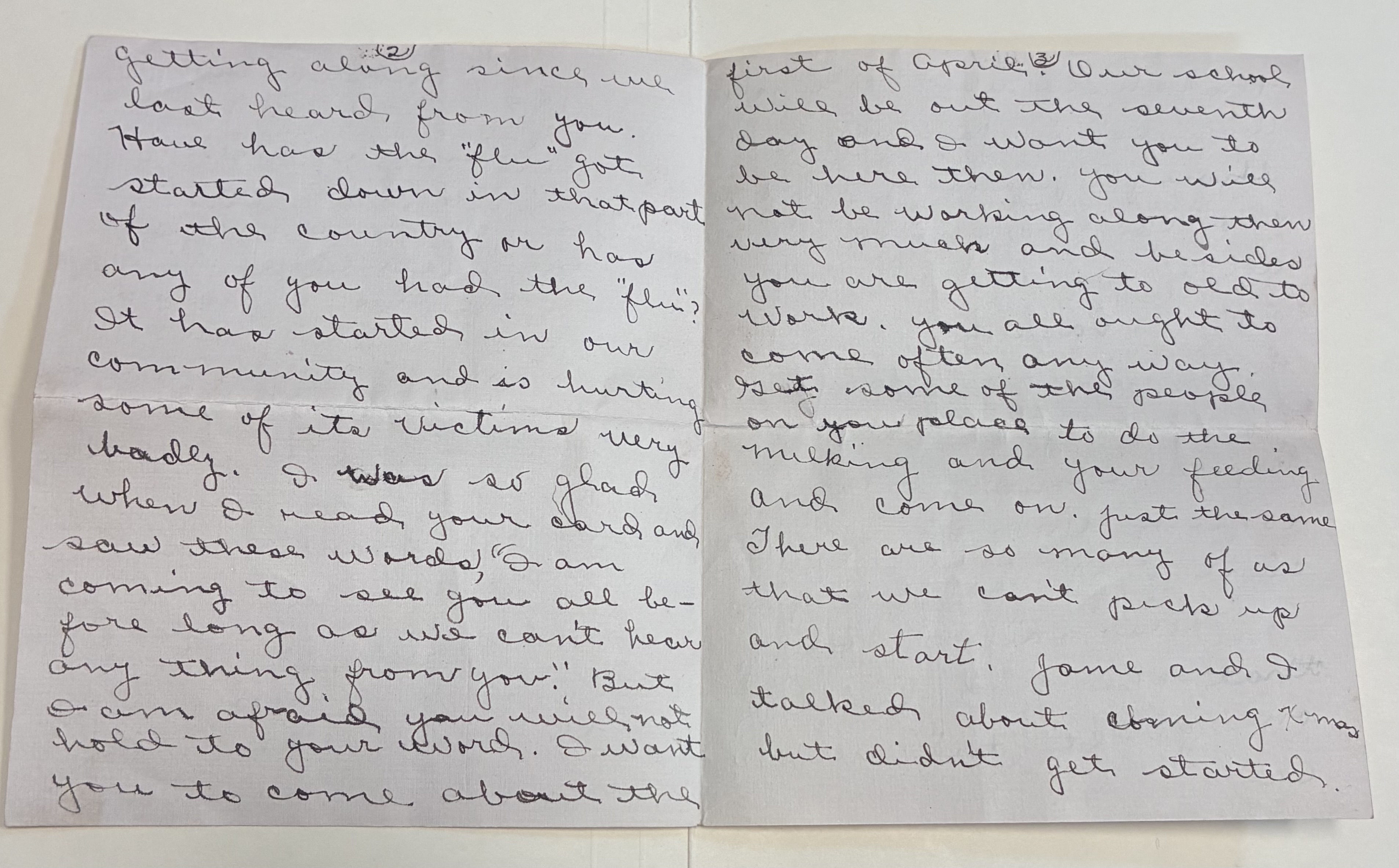 getting along since we last heard, from you. Have has the "flu" got started down in that part of of the country or has any of you had the "flu"? It has started in our community and is hurting some of its victims very badly. I was so glad when I read your card and saw these words, "I am coming to see you all be-fore long as we can't hear any thnig, from you." But I am afraid you will not hold to your word. I want you to come about the