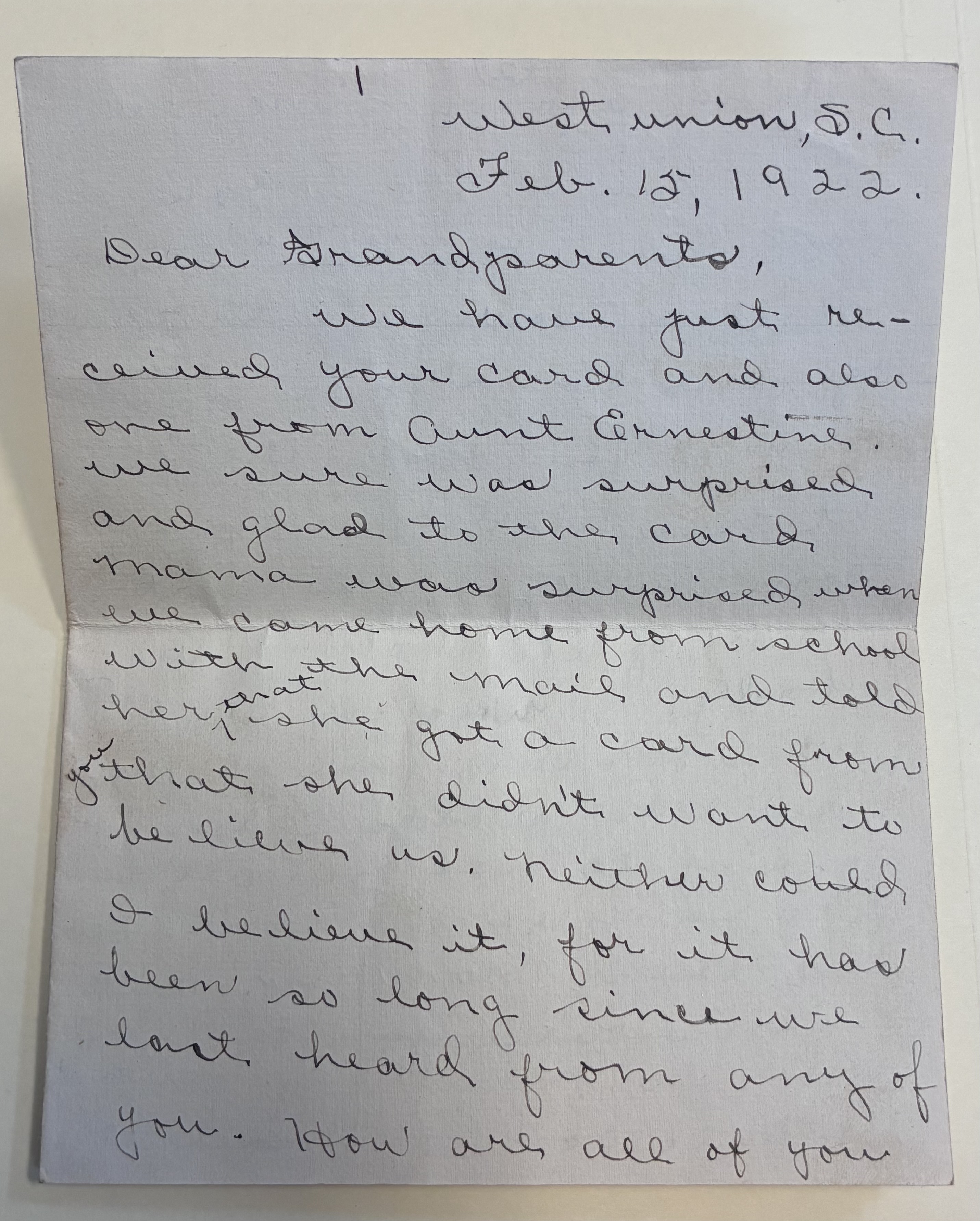 We have just re-ceived your card and also one from Aunt Ernestine. We sure was surprised and glad to the card Mama was surprised when we came home from school with the mail and told her ^that she got a card from you that she didn't want to believe us. Neither could I believe it, for it has been so long since we last heard from any of you. How are all of you