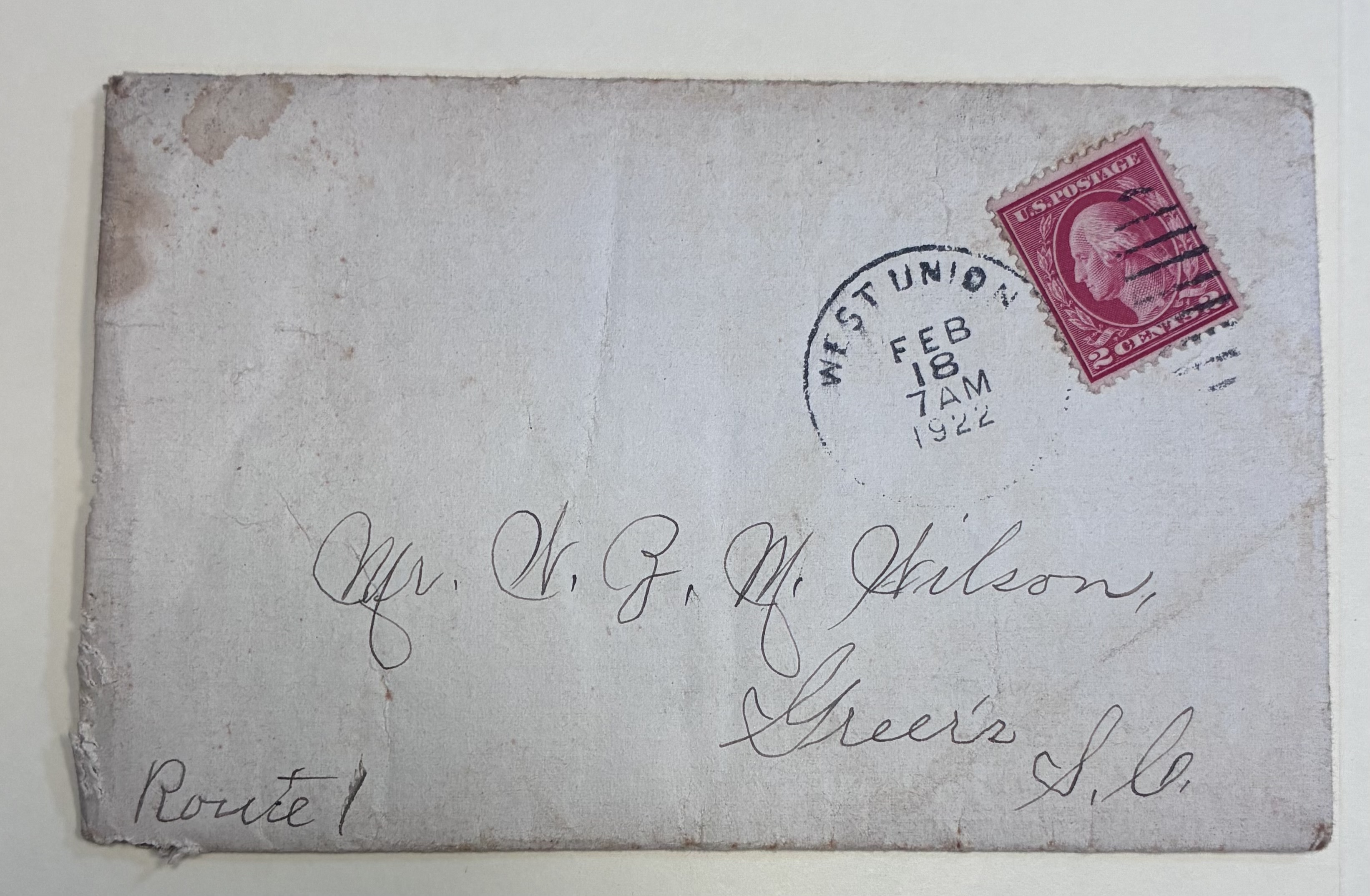 - Mr. W.Z.M. Wilson Envelope and Letter, Greer's, S.C.