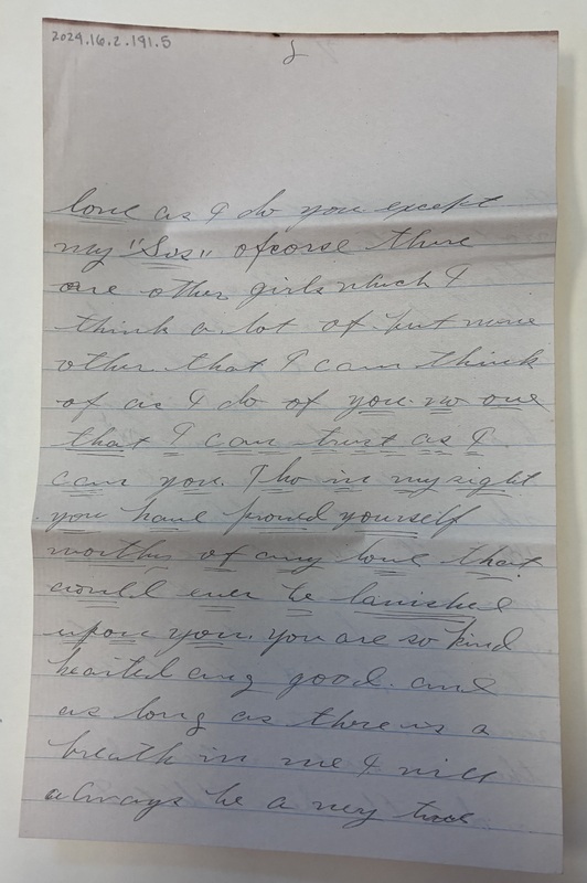 love as I do you except my "Sir" of over there are other girls which I think a lot of but more other that I can think of are I do of you [illegible] one that I can hurt as I can you Tho in my right you have found yourself worth of any but that could ever be lanished upon you. you are so kind hearted and good and as long as there is a heart in me I will [illegible] be very true