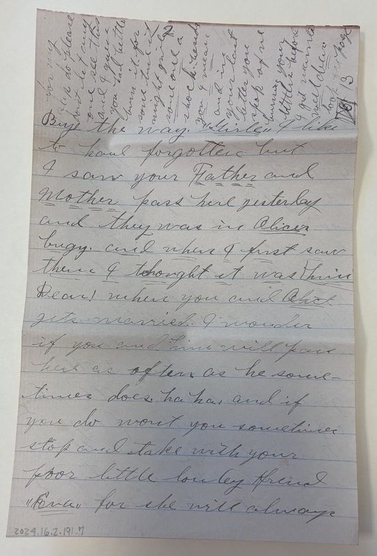 By the way. "Girle" I like to have forgotten but I saw your Father and Mother pass here yesterday and they was in Alice's bugy and when I just saw there I thought it was him Dear! when you and [illegible] gets married I wonder if you and him will pass here as often as he some-times does. ha. ha. and if you do wont you sometimes stop and take with your poor little lonley friend "Eva" for she will always