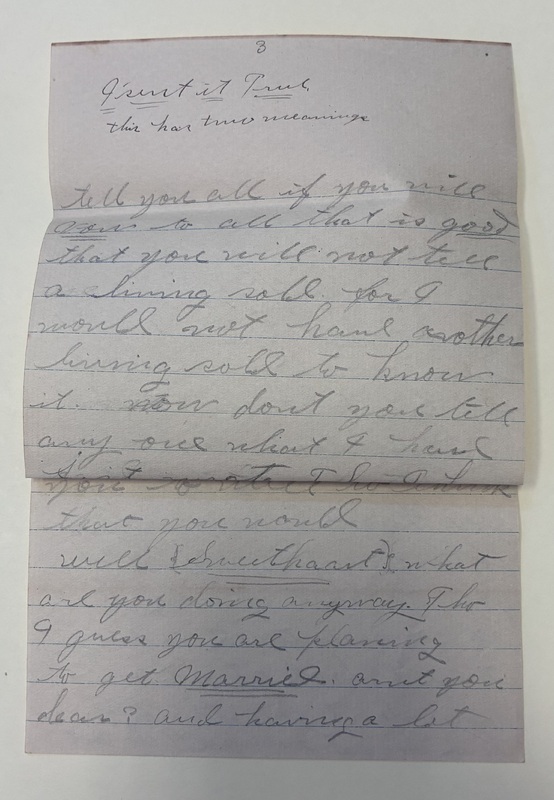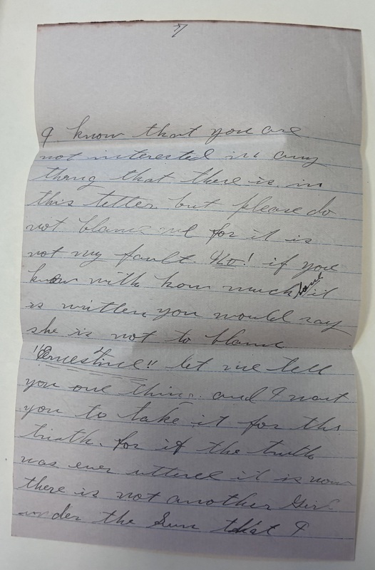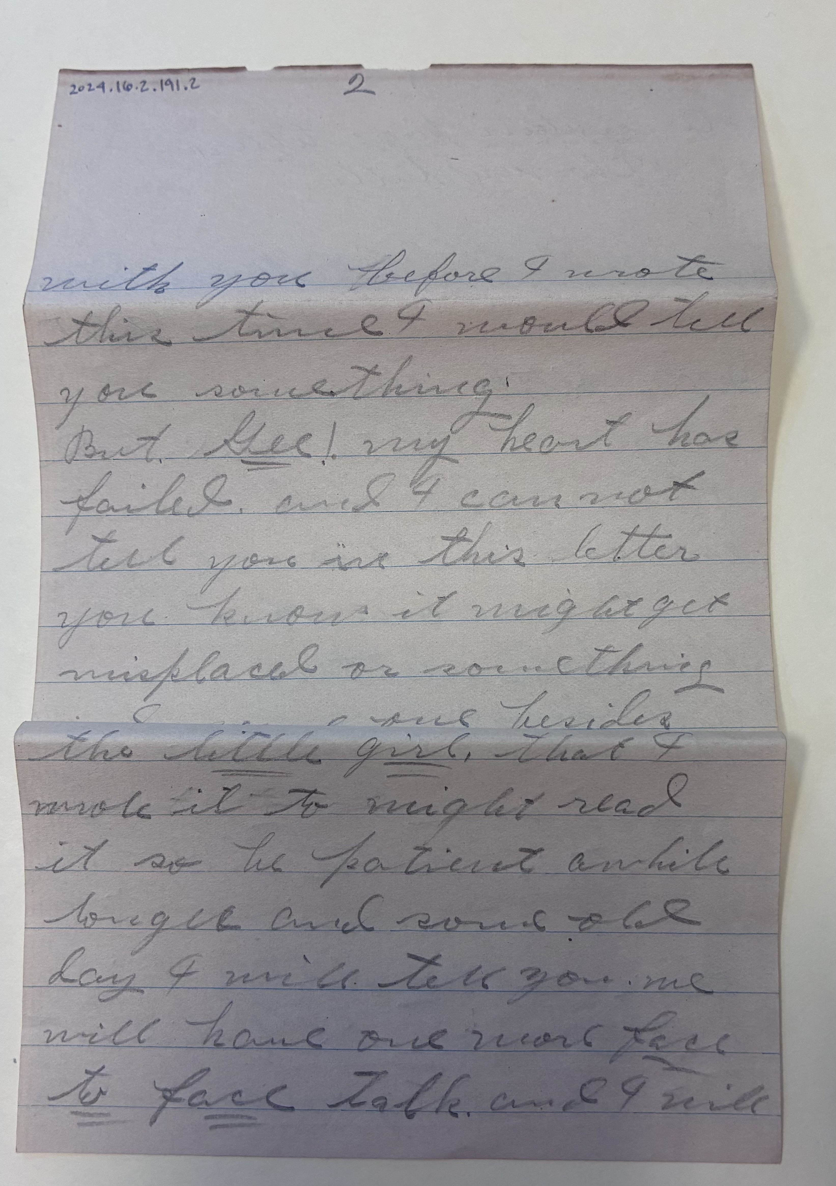 But Gee! my heart have failed and I cannot tell you in this letter you know it might get misplaced or something and some one besides the little girl, that I wrote it to might read it so be patient awhile longer and some old day I will tell you me will have one more face to face talk and I will