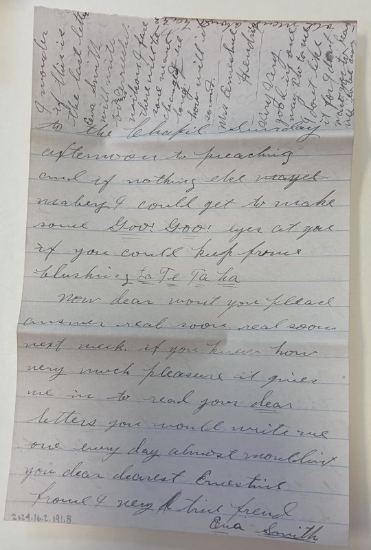 [Top space of letter continuing the message from the top space of the front of 191.8] I wonder if this is the last letter Eva Smith will write to Miss Ernestine Wilson I fare there will be some [illegible] changed be long. how will it sound. Mrs Ernestine Hendrix. Very Very good in one way Tho to use I dont like it for I dont want you to use so be one last old name about ha ha [continued on the top space of the front of 191.9]
