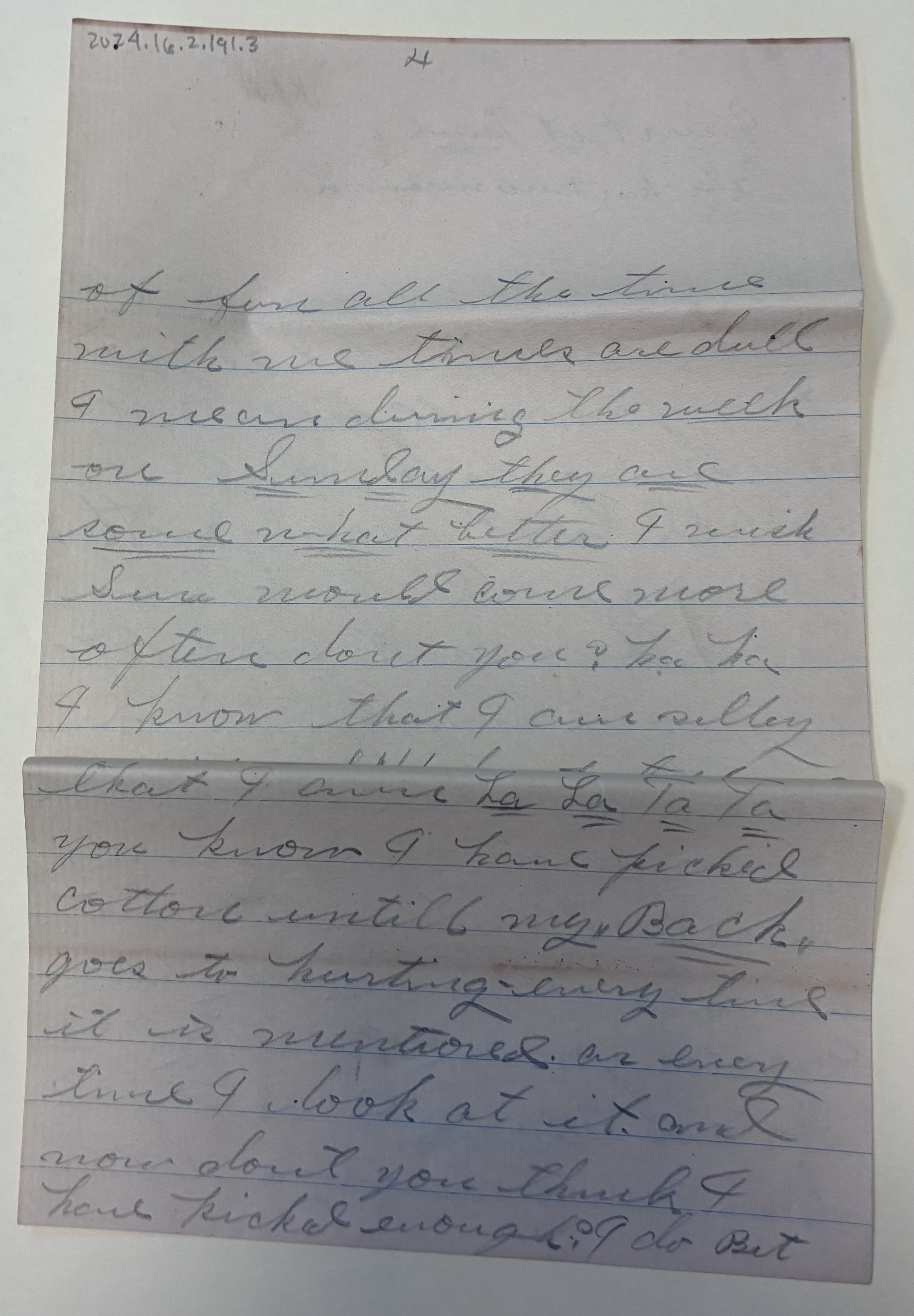 of fun all the time with me times are dull I mean during the week one Sunday they are some what better I wish Seare would come more often dont you? ha ha I know that I am silley But Hush!!! dont tell me that I [illegible] La La Ta Ta you know I have picked cotton until my ,,Back,, goes to hurting every time it is mentioned or every time I look at it and now dont you think I have picked enough? I do But