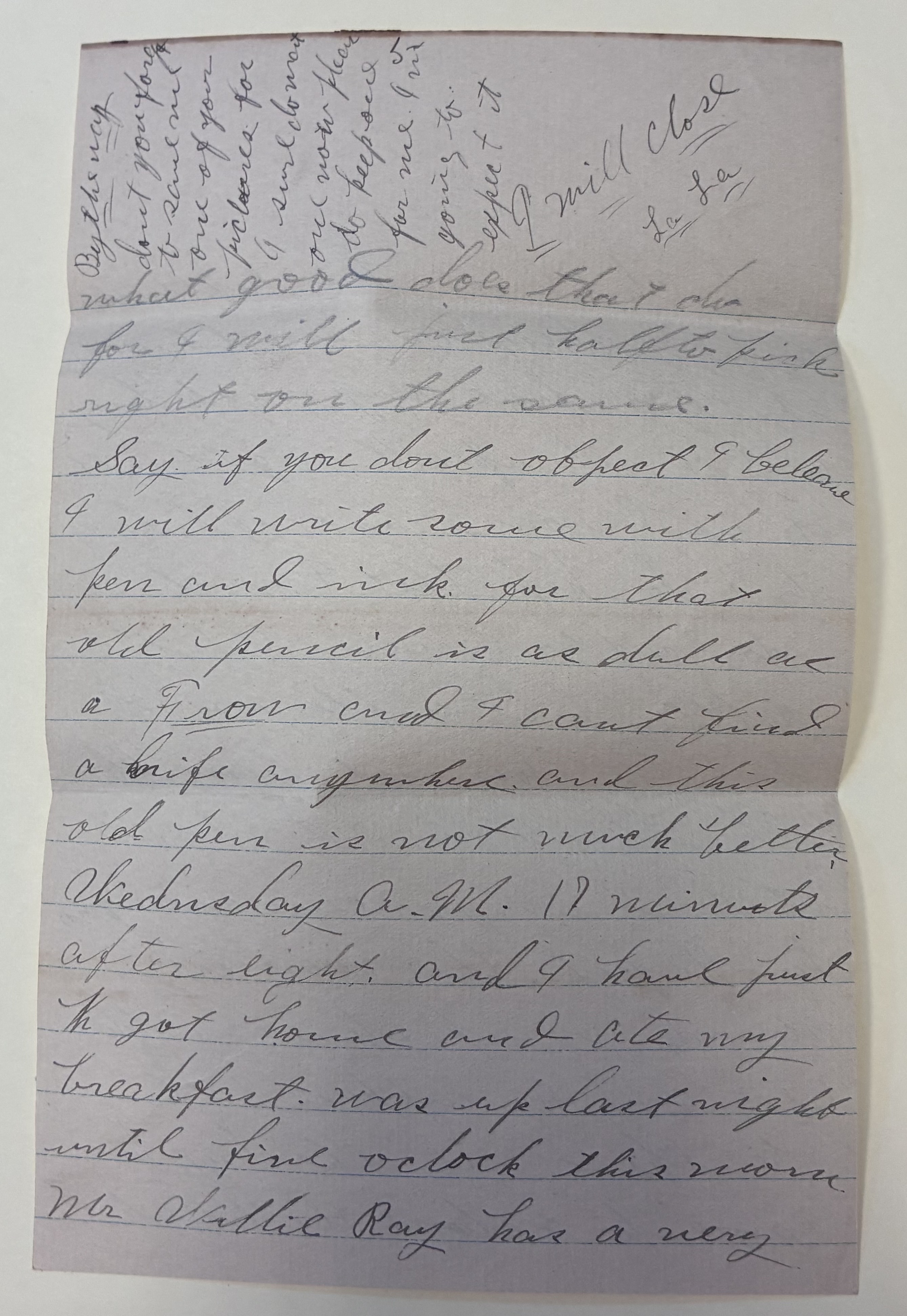 Say if you dont often I believe I will write some with pen and nick you for that old pencil is as dull as a Fron and I cant find a knife anywhere and this old pen is not much better Wednesday A.M. If minute after night and I have just I got home and ate my breakfast was up last night until five oclock this morn Mr Wallie Ray has a very