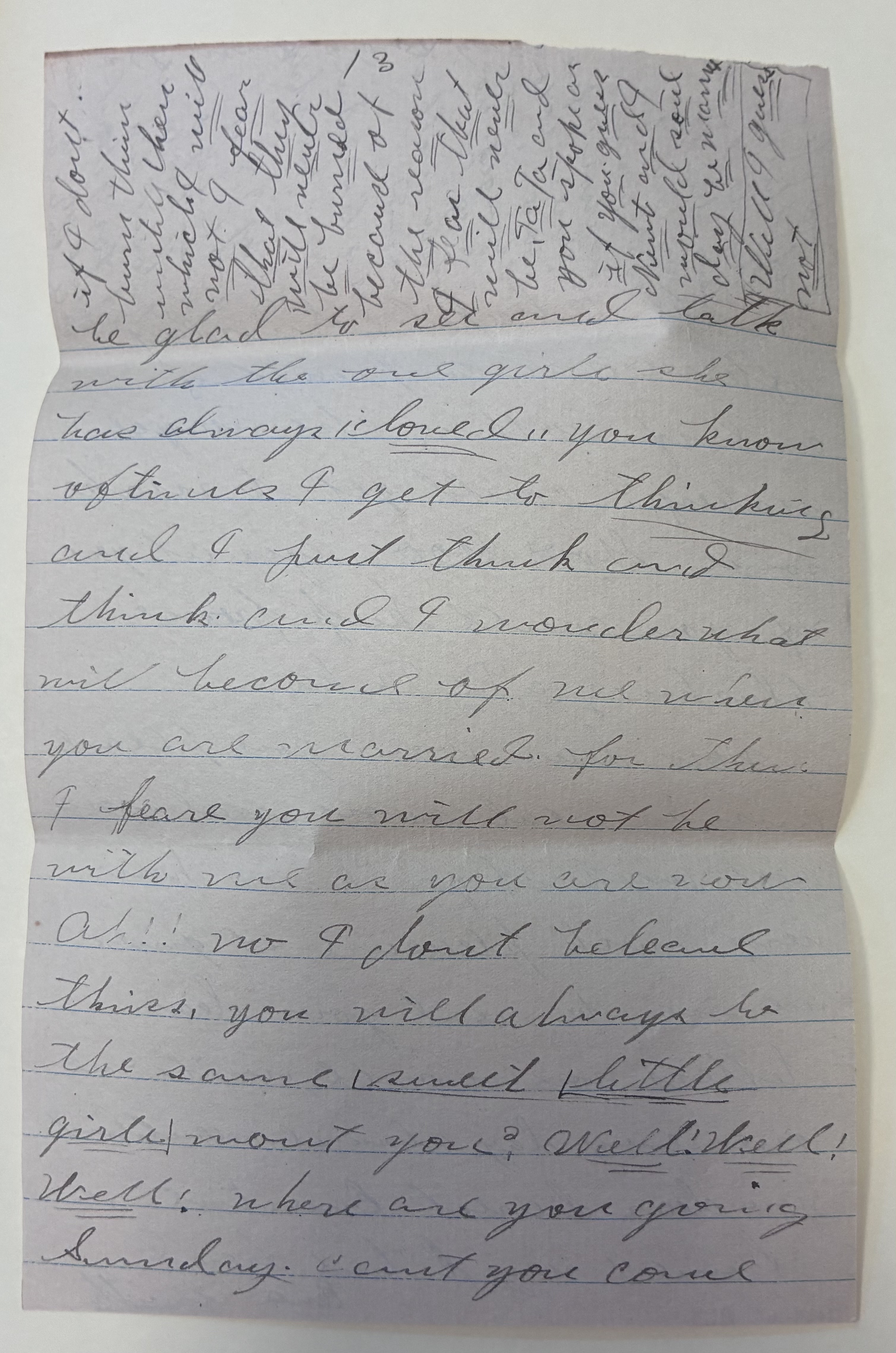 be glad to see and talk write the one girle she have always "loved" you know of times I get to thinking and I just think and think and I wonder what will become of me when you are married for then I fear you will not be with me as you are now Ah!! no I dont believe thiss, you will always be the same sweet little girle wont you? Well! Well! Well! where are you going Sunday cant you come