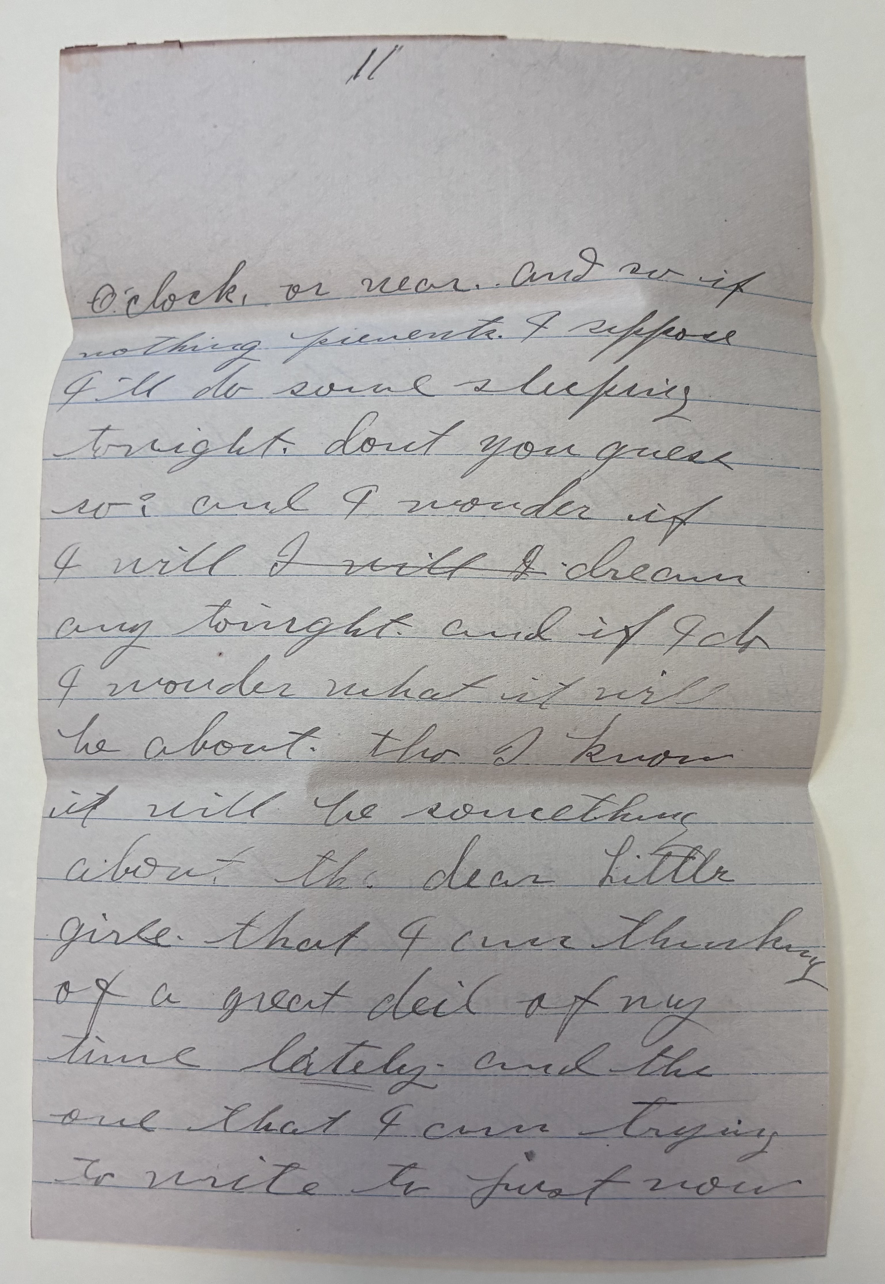 oclock or near and so if nothin presents. I suppose I'll do some sleeping tonight, dont you guess so; and I wonder if I will I will I [I will I struck out] dream any tonight and if I do I wonder what it will be about tho I know it will be something about the dear little girle that I am thinking of a greal deil of my time lately and the one that I am trying to write to just now